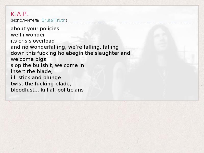 about your policies well i wonder its crisis overload and no wonderfalling, we're falling, falling down this fucking holebegin the slaughter and welcome pigs slop the bullshit, welcome in insert the blade, i'll stick and plunge twist the fucking blade, bloodlust... kill all politicians
