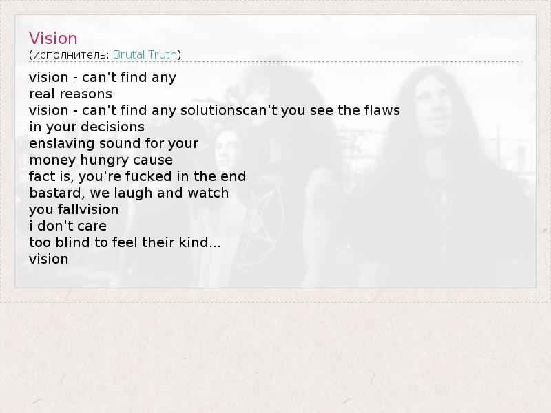 Это интересно:Brutal Truth – редкий образец "грайнда с мозгами", с собственной внутренней культурой, далёкой от потрошения зверушек или абстрактных религиозных посланий. Наверное, в случае можно говорить не о музыке, как таковой, хотя, экспериментируют музыканты в рамках грайндкора постоянно. Суть скорее состояние души и способ выплеска энергии, при уникальном сочетании нескольких различных экстремальных... продолжение