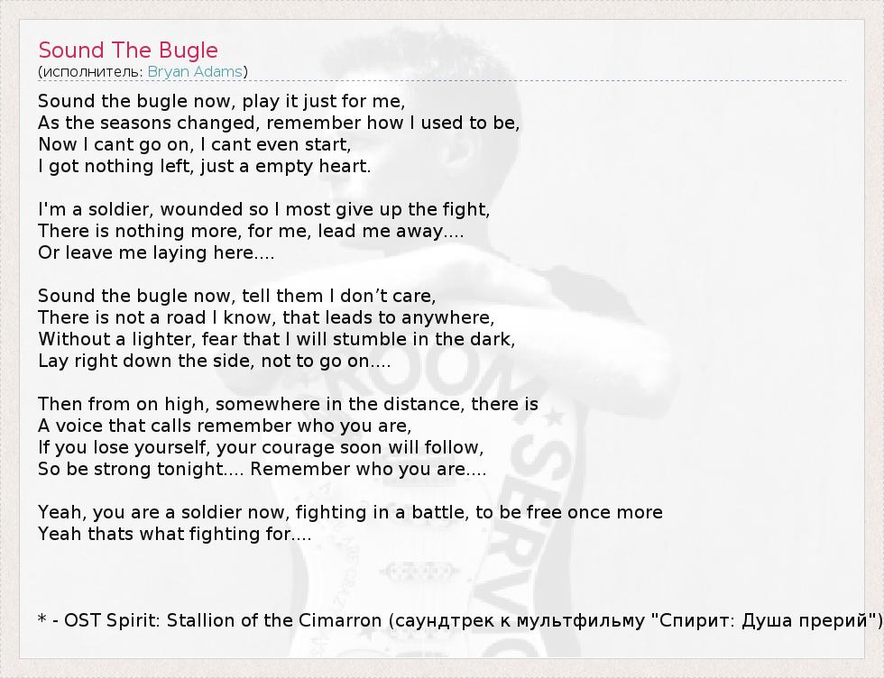 Sound the bugle now, play it just for me, As the seasons changed, remember how I used to be, Now I cant go on, I cant even start, I got nothing left, just a empty heart. I'm a soldier, wounded so I most give up the fight, There is nothing more, for me, lead me away.... Or leave me laying here.... Sound the bugle now, tell them I don’t care, There is not a road I know, that leads to anywhere, Without a lighter, fear that I will stumble in the dark, Lay right down the side, not to go on.... Then from on high, somewhere in the distance, there is A voice that calls remember who you are, If you lose yourself, your courage soon will follow, So be strong tonight.... Remember who you are.... Yeah, you are a soldier now, fighting in a battle, to be free once more Yeah thats what fighting for.... * - OST Spirit: Stallion of the Cimarron (саундтрек к мультфильму "Спирит: Душа прерий")