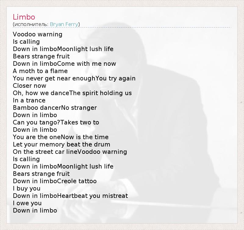 Voodoo warning Is calling Down in limboMoonlight lush life Bears strange fruit Down in limboCome with me now A moth to a flame You never get near enoughYou try again Closer now Oh, how we danceThe spirit holding us In a trance Bamboo dancerNo stranger Down in limbo Can you tango?Takes two to Down in limbo You are the oneNow is the time Let your memory beat the drum On the street car lineVoodoo warning Is calling Down in limboMoonlight lush life Bears strange fruit Down in limboCreole tattoo I buy you Down in limboHeartbeat you mistreat I owe you Down in limbo