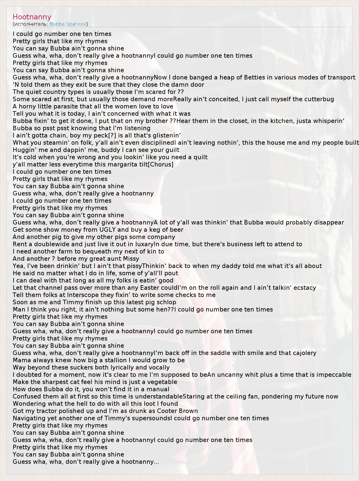 I could go number one ten times Pretty girls that like my rhymes You can say Bubba ain't gonna shine Guess wha, wha, don't really give a hootnannyI could go number one ten times Pretty girls that like my rhymes You can say Bubba ain't gonna shine Guess wha, wha, don't really give a hootnannyNow I done banged a heap of Betties in various modes of transport 'N told them as they exit be sure that they close the damn door The quiet country types is usually those I'm scared for ?? Some scared at first, but usually those demand moreReally ain't conceited, I just call myself the cutterbug A horny little parasite that all the women love to love Tell you what it is today, I ain't concerned with what it was Bubba fixin' to get it done, I put that on my brother ??Hear them in the closet, in the kitchen, justa whisperin' Bubba so psst psst knowing that I'm listening I ain't gotta chain, boy my peck[?] is all that's glistenin' What you steamin' on folk, y'all ain't even disciplinedI ain't leaving nothin', this the house me and my people built Huggin' me and dappin' me, buddy I can see your guilt It's cold when you're wrong and you lookin' like you need a quilt y'all matter less everytime this margarita tilt[Chorus] I could go number one ten times Pretty girls that like my rhymes You can say Bubba ain't gonna shine Guess wha, wha, don't really give a hootnanny I could go number one ten times Pretty girls that like my rhymes You can say Bubba ain't gonna shine Guess wha, wha, don't really give a hootnannyA lot of y'all was thinkin' that Bubba would probably disappear Get some show money from UGLY and buy a keg of beer And another pig to give my other pigs some company Rent a doublewide and just live it out in luxaryIn due time, but there's business left to attend to I need another farm to bequeath my next of kin to And another ? before my great aunt Missy Yea, I've been drinkin' but I ain't that pissyThinkin' back to when my daddy told me what it's all about He said no matter what I do in life, some of y'all'll pout I can deal with that long as all my folks is eatin' good Let that channel pass over more than any Easter couldI'm on the roll again and I ain't talkin' ecstacy Tell them folks at Interscope they fixin' to write some checks to me Soon as me and Timmy finish up this latest pig schlop Man I think you right, it ain't nothing but some hen??I could go number one ten times Pretty girls that like my rhymes You can say Bubba ain't gonna shine Guess wha, wha, don't really give a hootnannyI could go number one ten times Pretty girls that like my rhymes You can say Bubba ain't gonna shine Guess wha, wha, don't really give a hootnannyI'm back off in the saddle with smile and that cajolery Mama always knew how big a stallion I would grow to be Way beyond these suckers both lyrically and vocally I doubted for a moment, now it's clear to me I'm supposed to beAn uncanny whit plus a time that is impeccable Make the sharpest cat feel his mind is just a vegetable How does Bubba do it, you won't find it in a manual Confused them all at first so this time is understandableStaring at the ceiling fan, pondering my future now Wondering what the hell to do with all this loot I found Got my tractor polished up and I'm as drunk as Cooter Brown Navigating yet another one of Timmy's supersoundsI could go number one ten times Pretty girls that like my rhymes You can say Bubba ain't gonna shine Guess wha, wha, don't really give a hootnannyI could go number one ten times Pretty girls that like my rhymes You can say Bubba ain't gonna shine Guess wha, wha, don't really give a hootnanny...