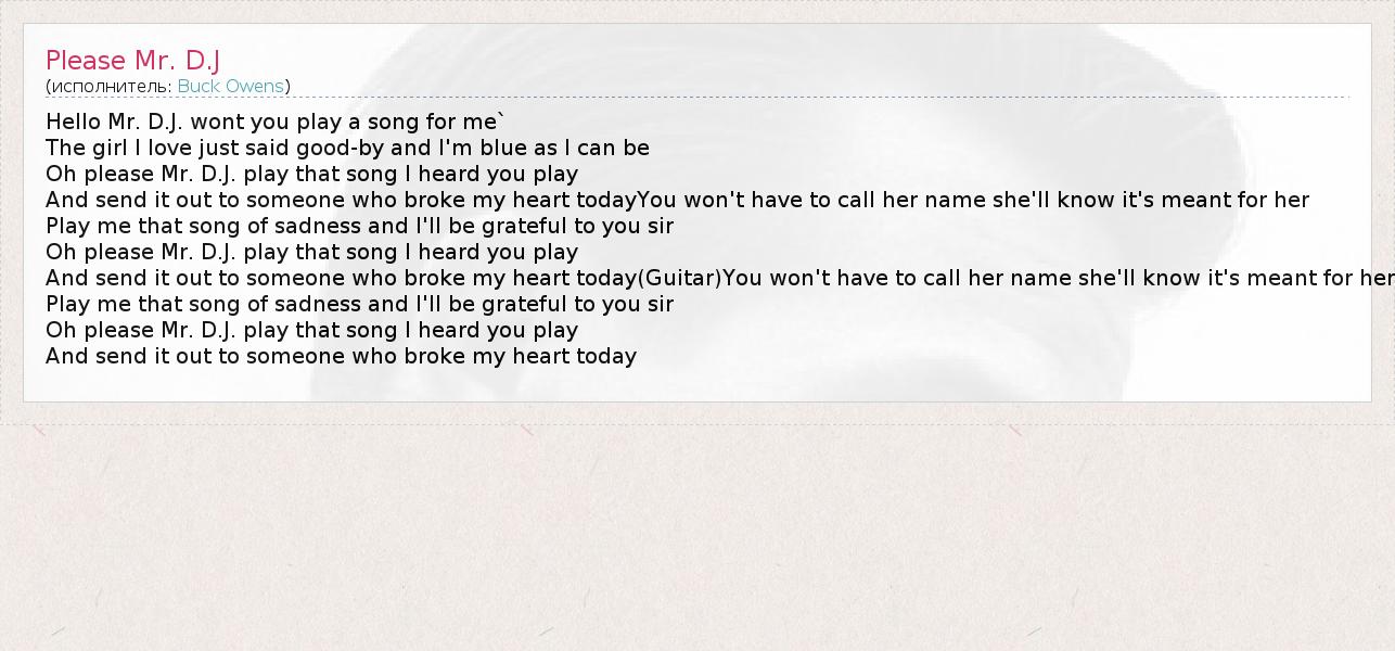 Hello Mr. D.J. wont you play a song for me` The girl I love just said good-by and I'm blue as I can be Oh please Mr. D.J. play that song I heard you play And send it out to someone who broke my heart todayYou won't have to call her name she'll know it's meant for her Play me that song of sadness and I'll be grateful to you sir Oh please Mr. D.J. play that song I heard you play And send it out to someone who broke my heart today(Guitar)You won't have to call her name she'll know it's meant for her Play me that song of sadness and I'll be grateful to you sir Oh please Mr. D.J. play that song I heard you play And send it out to someone who broke my heart today