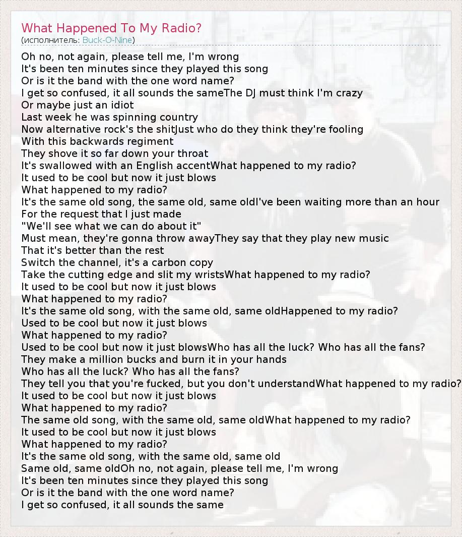 Oh no, not again, please tell me, I'm wrong It's been ten minutes since they played this song Or is it the band with the one word name? I get so confused, it all sounds the sameThe DJ must think I'm crazy Or maybe just an idiot Last week he was spinning country Now alternative rock's the shitJust who do they think they're fooling With this backwards regiment They shove it so far down your throat It's swallowed with an English accentWhat happened to my radio? It used to be cool but now it just blows What happened to my radio? It's the same old song, the same old, same oldI've been waiting more than an hour For the request that I just made "We'll see what we can do about it" Must mean, they're gonna throw awayThey say that they play new music That it's better than the rest Switch the channel, it's a carbon copy Take the cutting edge and slit my wristsWhat happened to my radio? It used to be cool but now it just blows What happened to my radio? It's the same old song, with the same old, same oldHappened to my radio? Used to be cool but now it just blows What happened to my radio? Used to be cool but now it just blowsWho has all the luck? Who has all the fans? They make a million bucks and burn it in your hands Who has all the luck? Who has all the fans? They tell you that you're fucked, but you don't understandWhat happened to my radio? It used to be cool but now it just blows What happened to my radio? The same old song, with the same old, same oldWhat happened to my radio? It used to be cool but now it just blows What happened to my radio? It's the same old song, with the same old, same old Same old, same oldOh no, not again, please tell me, I'm wrong It's been ten minutes since they played this song Or is it the band with the one word name? I get so confused, it all sounds the same