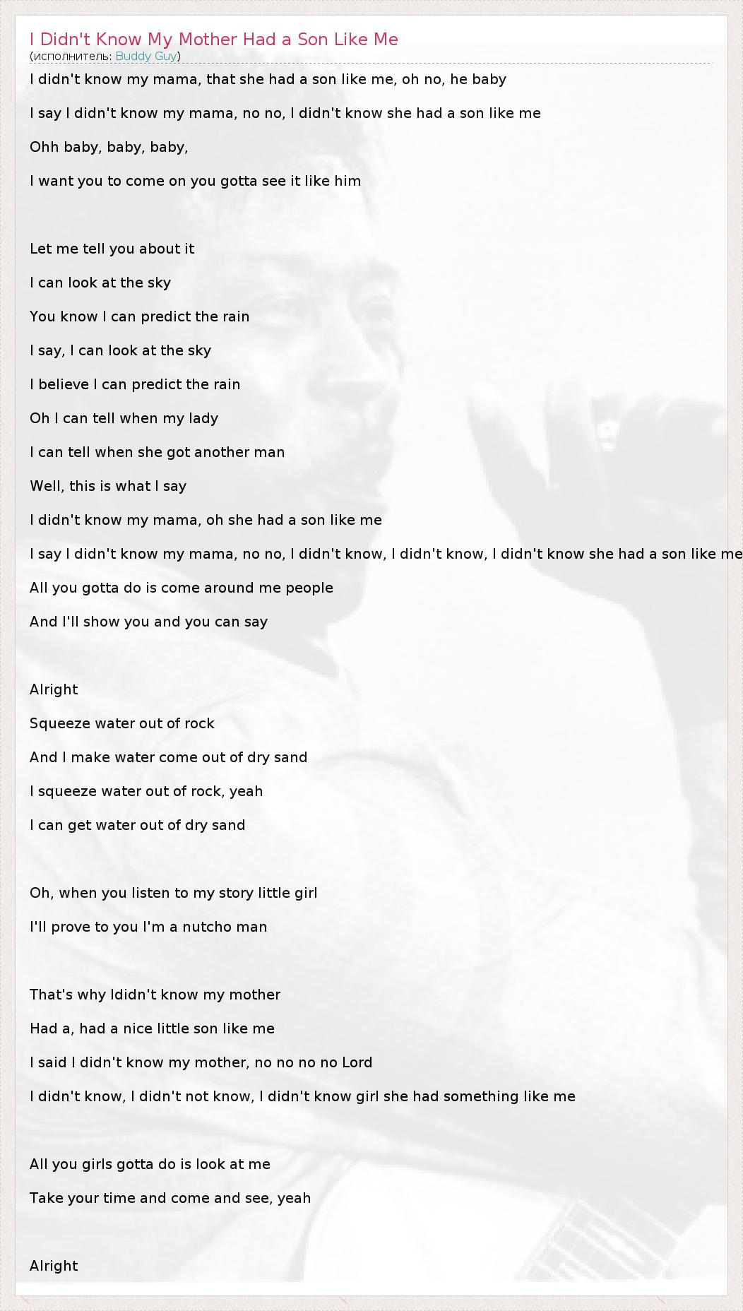 I didn't know my mama, that she had a son like me, oh no, he baby I say I didn't know my mama, no no, I didn't know she had a son like me Ohh baby, baby, baby, I want you to come on you gotta see it like him Let me tell you about it I can look at the sky You know I can predict the rain I say, I can look at the sky I believe I can predict the rain Oh I can tell when my lady I can tell when she got another man Well, this is what I say I didn't know my mama, oh she had a son like me I say I didn't know my mama, no no, I didn't know, I didn't know, I didn't know she had a son like me All you gotta do is come around me people And I'll show you and you can say Alright Squeeze water out of rock And I make water come out of dry sand I squeeze water out of rock, yeah I can get water out of dry sand Oh, when you listen to my story little girl I'll prove to you I'm a nutcho man That's why Ididn't know my mother Had a, had a nice little son like me I said I didn't know my mother, no no no no Lord I didn't know, I didn't not know, I didn't know girl she had something like me All you girls gotta do is look at me Take your time and come and see, yeah Alright