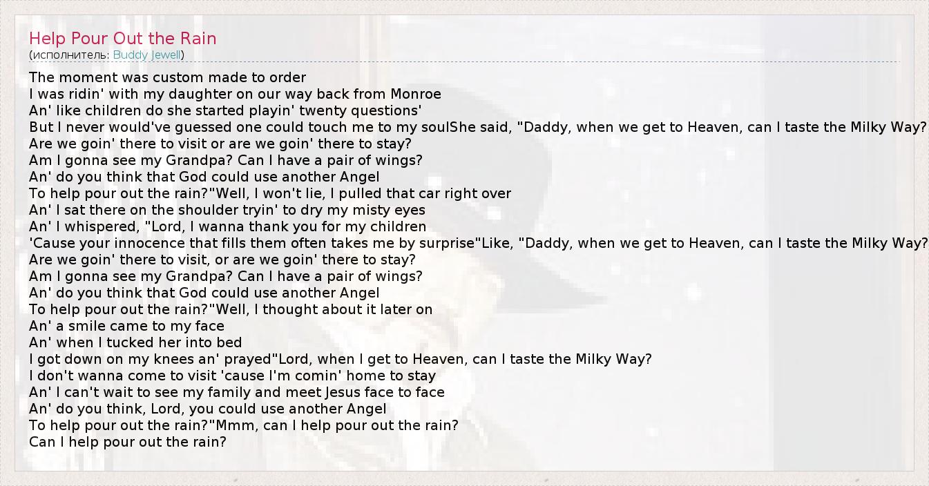 The moment was custom made to order I was ridin' with my daughter on our way back from Monroe An' like children do she started playin' twenty questions' But I never would've guessed one could touch me to my soulShe said, "Daddy, when we get to Heaven, can I taste the Milky Way? Are we goin' there to visit or are we goin' there to stay? Am I gonna see my Grandpa? Can I have a pair of wings? An' do you think that God could use another Angel To help pour out the rain?"Well, I won't lie, I pulled that car right over An' I sat there on the shoulder tryin' to dry my misty eyes An' I whispered, "Lord, I wanna thank you for my children 'Cause your innocence that fills them often takes me by surprise"Like, "Daddy, when we get to Heaven, can I taste the Milky Way? Are we goin' there to visit, or are we goin' there to stay? Am I gonna see my Grandpa? Can I have a pair of wings? An' do you think that God could use another Angel To help pour out the rain?"Well, I thought about it later on An' a smile came to my face An' when I tucked her into bed I got down on my knees an' prayed"Lord, when I get to Heaven, can I taste the Milky Way? I don't wanna come to visit 'cause I'm comin' home to stay An' I can't wait to see my family and meet Jesus face to face An' do you think, Lord, you could use another Angel To help pour out the rain?"Mmm, can I help pour out the rain? Can I help pour out the rain?