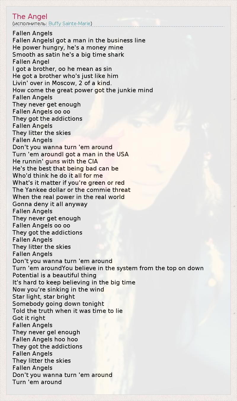 Fallen Angels Fallen AngelsI got a man in the business line He power hungry, he's a money mine Smooth as satin he's a big time shark Fallen Angel I got a brother, oo he mean as sin He got a brother who's just like him Livin' over in Moscow, 2 of a kind. How come the great power got the junkie mind Fallen Angels They never get enough Fallen Angels oo oo They got the addictions Fallen Angels They litter the skies Fallen Angels Don't you wanna turn 'em around Turn 'em aroundI got a man in the USA He runnin' guns with the CIA He's the best that being bad can be Who'd think he do it all for me What's it matter if you're green or red The Yankee dollar or the commie threat When the real power in the real world Gonna deny it all anyway Fallen Angels They never get enough Fallen Angels oo oo They got the addictions Fallen Angels They litter the skies Fallen Angels Don't you wanna turn 'em around Turn 'em aroundYou believe in the system from the top on down Potential is a beautiful thing It's hard to keep believing in the big time Now you're sinking in the wind Star light, star bright Somebody going down tonight Told the truth when it was time to lie Got it right Fallen Angels They never gel enough Fallen Angels hoo hoo They got the addictions Fallen Angels They litter the skies Fallen Angels Don't you wanna turn 'em around Turn 'em around