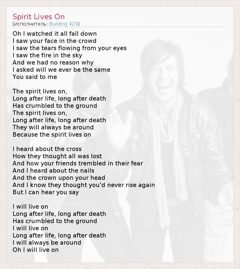 Oh I watched it all fall down I saw your face in the crowd I saw the tears flowing from your eyes I saw the fire in the sky And we had no reason why I asked will we ever be the same You said to me The spirit lives on, Long after life, long after death Has crumbled to the ground The spirit lives on, Long after life, long after death They will always be around Because the spirit lives on I heard about the cross How they thought all was lost And how your friends trembled in their fear And I heard about the nails And the crown upon your head And I know they thought you'd never rise again But I can hear you say I will live on Long after life, long after death Has crumbled to the ground I will live on Long after life, long after death I will always be around Oh I will live on