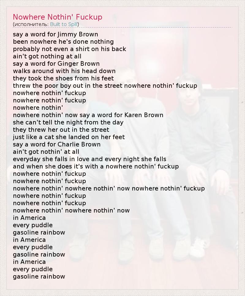 say a word for Jimmy Brown been nowhere he's done nothing probably not even a shirt on his back ain't got nothing at all say a word for Ginger Brown walks around with his head down they took the shoes from his feet threw the poor boy out in the street nowhere nothin' fuckup nowhere nothin' fuckup nowhere nothin' fuckup nowhere nothin' nowhere nothin' now say a word for Karen Brown she can't tell the night from the day they threw her out in the street just like a cat she landed on her feet say a word for Charlie Brown ain't got nothin' at all everyday she falls in love and every night she falls and when she does it's with a nowhere nothin' fuckup nowhere nothin' fuckup nowhere nothin' fuckup nowhere nothin' nowhere nothin' now nowhere nothin' fuckup nowhere nothin' fuckup nowhere nothin' fuckup nowhere nothin' nowhere nothin' now in America every puddle gasoline rainbow in America every puddle gasoline rainbow in America every puddle gasoline rainbow