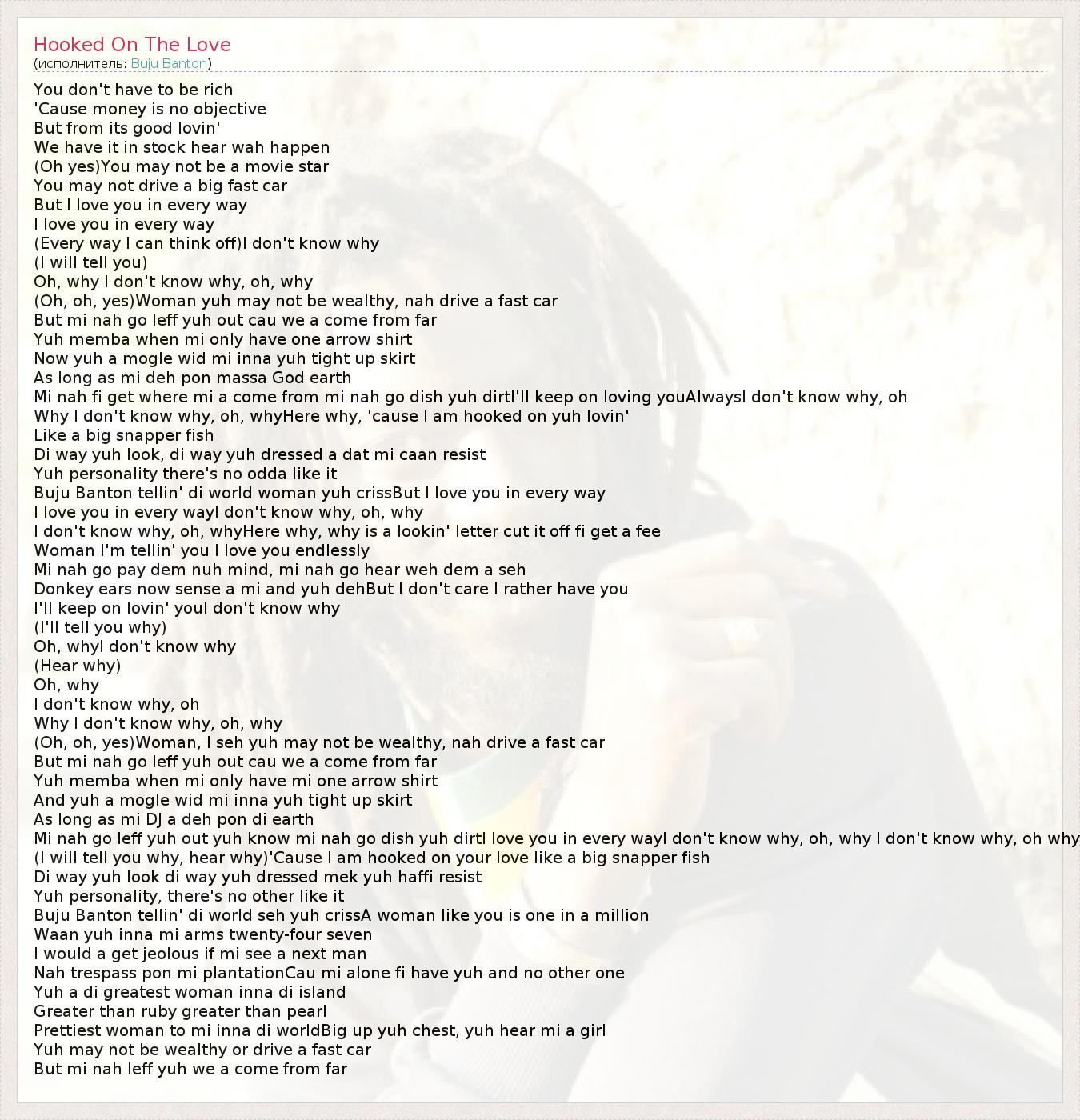 Why I don't know why, oh, whyHere why, 'cause I am hooked on yuh lovin'