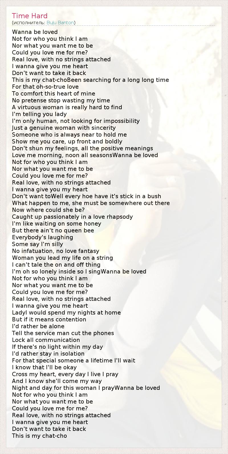 Wanna be loved Not for who you think I am Nor what you want me to be Could you love me for me? Real love, with no strings attached I wanna give you me heart Don't want to take it back This is my chat-choBeen searching for a long long time For that oh-so-true love To comfort this heart of mine No pretense stop wasting my time A virtuous woman is really hard to find I'm telling you lady I'm only human, not looking for impossibility Just a genuine woman with sincerity Someone who is always near to hold me Show me you care, up front and boldly Don't shun my feelings, all the positive meanings Love me morning, noon all seasonsWanna be loved Not for who you think I am Nor what you want me to be Could you love me for me? Real love, with no strings attached I wanna give you my heart Don't want toWell every hoe have it's stick in a bush What happen to me, she must be somewhere out there Now where could she be? Caught up passionately in a love rhapsody I'm like waiting on some honey But there ain't no queen bee Everybody's laughing Some say I'm silly No infatuation, no love fantasy Woman you lead my life on a string I can't tale the on and off thing I'm oh so lonely inside so I singWanna be loved Not for who you think I am Nor what you want me to be Could you love me for me? Real love, with no strings attached I wanna give you me heart LadyI would spend my nights at home But if it means contention I'd rather be alone Tell the service man cut the phones Lock all communication If there's no light within my day I'd rather stay in isolation For that special someone a lifetime I'll wait I know that I'll be okay Cross my heart, every day I live I pray And I know she'll come my way Night and day for this woman I prayWanna be loved Not for who you think I am Nor what you want me to be Could you love me for me? Real love, with no strings attached I wanna give you me heart Don't want to take it back This is my chat-cho