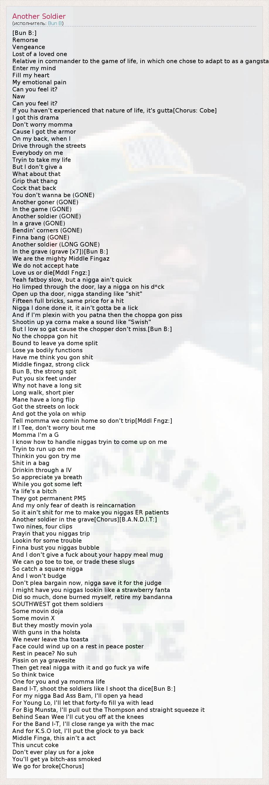 [Bun B:] Remorse Vengeance Lost of a loved one Relative in commander to the game of life, in which one chose to adapt to as a gangsta Enter my mind Fill my heart My emotional pain Can you feel it? Naw Can you feel it? If you haven't experienced that nature of life, it's gutta[Chorus: Cobe] I got this drama Don't worry momma Cause I got the armor On my back, when I Drive through the streets Everybody on me Tryin to take my life But I don't give a What about that Grip that thang Cock that back You don't wanna be (GONE) Another goner (GONE) In the game (GONE) Another soldier (GONE) In a grave (GONE) Bendin' corners (GONE) Finna bang (GONE) Another soldier (LONG GONE) In the grave (grave [x7])[Bun B:] We are the mighty Middle Fingaz We do not accept hate Love us or die[Mddl Fngz:] Yeah fatboy slow, but a nigga ain't quick Ho limped through the door, lay a nigga on his d*ck Open up tha door, nigga standing like "shit" Fifteen full bricks, same price for a hit Nigga I done done it, it ain't gotta be a lick And if I'm plexin with you patna then the choppa gon piss Shootin up ya corna make a sound like "Swish" But I low so gat cause the chopper don't miss.[Bun B:] No the choppa gon hit Bound to leave ya dome split Lose ya bodily functions Have me think you gon shit Middle fingaz, strong click Bun B, the strong spit Put you six feet under Why not have a long sit Long walk, short pier Mane have a long flip Got the streets on lock And got the yola on whip Tell momma we comin home so don't trip[Mddl Fngz:] If I Tee, don't worry bout me Momma I'm a G I know how to handle niggas tryin to come up on me Tryin to run up on me Thinkin you gon try me Shit in a bag Drinkin through a IV So appreciate ya breath While you got some left Ya life's a bitch They got permanent PMS And my only fear of death is reincarnation So it ain't shit for me to make you niggas ER patients Another soldier in the grave[Chorus][B.A.N.D.I.T:] Two nines, four clips Prayin that you niggas trip Lookin for some trouble Finna bust you niggas bubble And I don't give a fuck about your happy meal mug We can go toe to toe, or trade these slugs So catch a square nigga And I won't budge Don't plea bargain now, nigga save it for the judge I might have you niggas lookin like a strawberry fanta Did so much, done burned myself, retire my bandanna SOUTHWEST got them soldiers Some movin doja Some movin X But they mostly movin yola With guns in tha holsta We never leave tha toasta Face could wind up on a rest in peace poster Rest in peace? No suh Pissin on ya gravesite Then get real nigga with it and go fuck ya wife So think twice One for you and ya momma life Band I-T, shoot the soldiers like I shoot tha dice[Bun B:] For my nigga Bad Ass Bam, I'll open ya head For Young Lo, I'll let that forty-fo fill ya with lead For Big Munsta, I'll pull out the Thompson and straight squeeze it Behind Sean Wee I'll cut you off at the knees For the Band I-T, I'll close range ya with the mac And for K.S.O lot, I'll put the glock to ya back Middle Finga, this ain't a act This uncut coke Don't ever play us for a joke You'll get ya bitch-ass smoked We go for broke[Chorus]