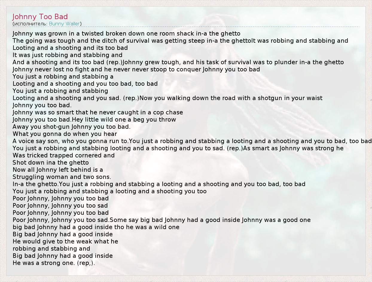 Johnny was grown in a twisted broken down one room shack in-a the ghetto The going was tough and the ditch of survival was getting steep in-a the ghettoIt was robbing and stabbing and Looting and a shooting and its too bad It was just robbing and stabbing and And a shooting and its too bad (rep.)Johnny grew tough, and his task of survival was to plunder in-a the ghetto Johnny never lost no fight and he never never stoop to conquer Johnny you too bad You just a robbing and stabbing a Looting and a shooting and you too bad, too bad You just a robbing and stabbing Looting and a shooting and you sad. (rep.)Now you walking down the road with a shotgun in your waist Johnny you too bad. Johnny was so smart that he never caught in a cop chase Johnny you too bad.Hey little wild one a beg you throw Away you shot-gun Johnny you too bad. What you gonna do when you hear A voice say son, who you gonna run to.You just a robbing and stabbing a looting and a shooting and you to bad, too bad You just a robbing and stabbing looting and a shooting and you to sad. (rep.)As smart as Johnny was strong he Was tricked trapped cornered and Shot down ina the ghetto Now all Johnny left behind is a Struggling woman and two sons. In-a the ghetto.You just a robbing and stabbing a looting and a shooting and you too bad, too bad You just a robbing and stabbing a looting and a shooting you too Poor Johnny, Johnny you too bad Poor Johnny, Johnny you too sad Poor Johnny, Johnny you too bad Poor Johnny, Johnny you too sad.Some say big bad Johnny had a good inside Johnny was a good one big bad Johnny had a good inside tho he was a wild one Big bad Johnny had a good inside He would give to the weak what he robbing and stabbing and Big bad Johnny had a good inside He was a strong one. (rep,).