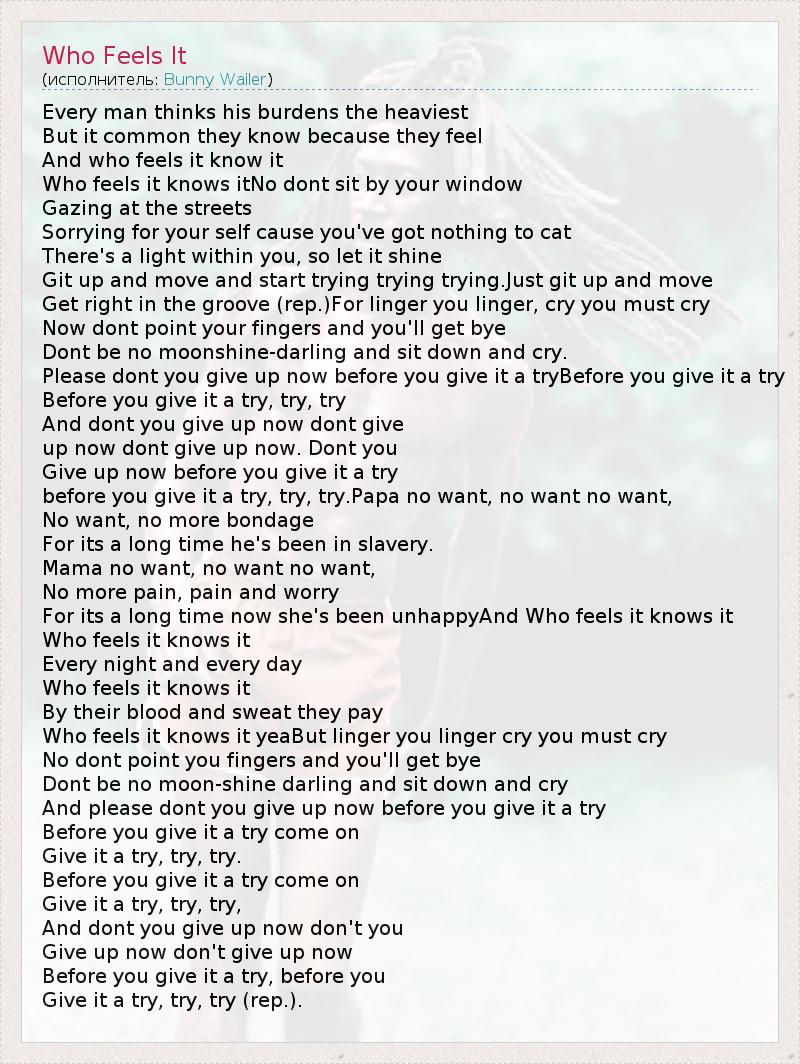 Every man thinks his burdens the heaviest But it common they know because they feel And who feels it know it Who feels it knows itNo dont sit by your window Gazing at the streets Sorrying for your self cause you've got nothing to cat There's a light within you, so let it shine Git up and move and start trying trying trying.Just git up and move Get right in the groove (rep.)For linger you linger, cry you must cry Now dont point your fingers and you'll get bye Dont be no moonshine-darling and sit down and cry. Please dont you give up now before you give it a tryBefore you give it a try Before you give it a try, try, try And dont you give up now dont give up now dont give up now. Dont you Give up now before you give it a try before you give it a try, try, try.Papa no want, no want no want, No want, no more bondage For its a long time he's been in slavery. Mama no want, no want no want, No more pain, pain and worry For its a long time now she's been unhappyAnd Who feels it knows it Who feels it knows it Every night and every day Who feels it knows it By their blood and sweat they pay Who feels it knows it yeaBut linger you linger cry you must cry No dont point you fingers and you'll get bye Dont be no moon-shine darling and sit down and cry And please dont you give up now before you give it a try Before you give it a try come on Give it a try, try, try. Before you give it a try come on Give it a try, try, try, And dont you give up now don't you Give up now don't give up now Before you give it a try, before you Give it a try, try, try (rep.).