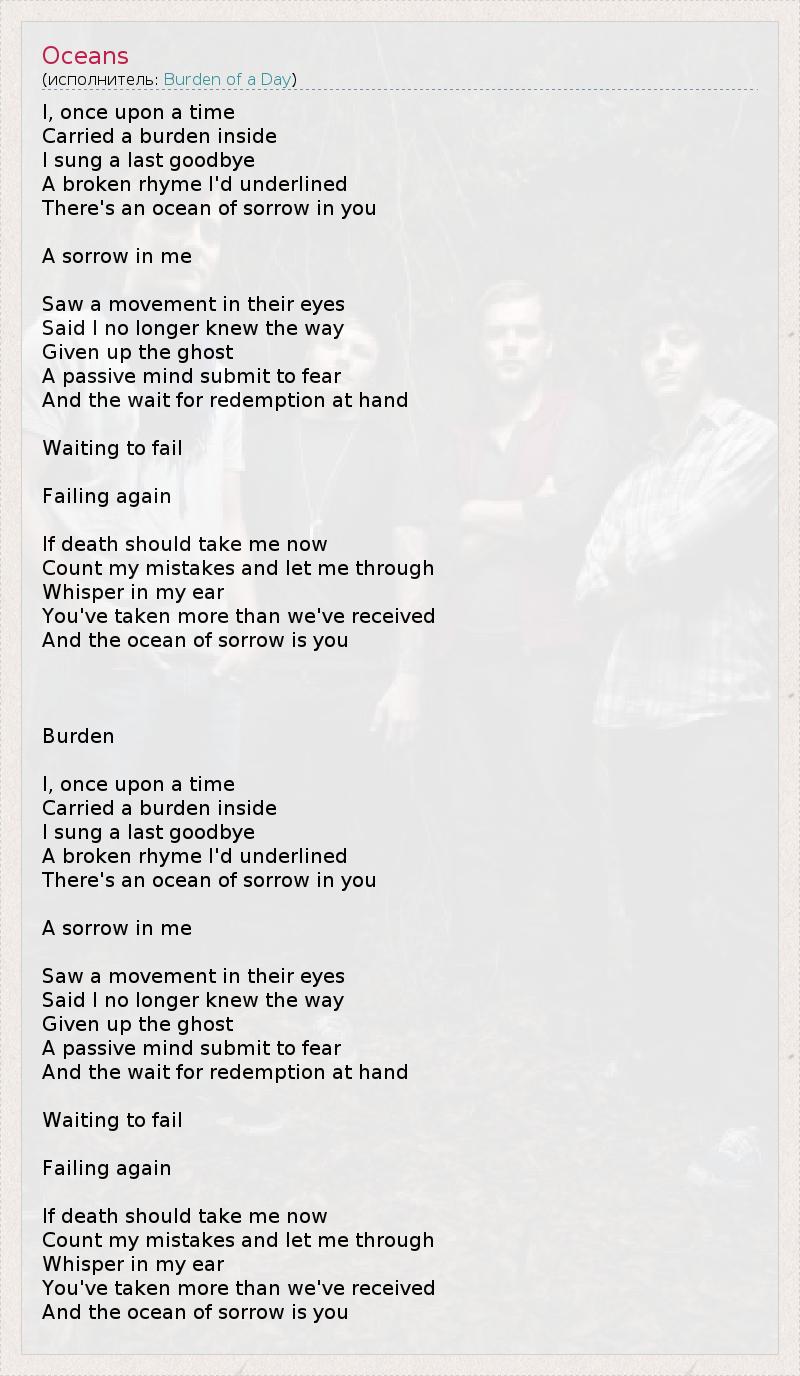 I, once upon a time Carried a burden inside I sung a last goodbye A broken rhyme I'd underlined There's an ocean of sorrow in you A sorrow in me Saw a movement in their eyes Said I no longer knew the way Given up the ghost A passive mind submit to fear And the wait for redemption at hand Waiting to fail Failing again If death should take me now Count my mistakes and let me through Whisper in my ear You've taken more than we've received And the ocean of sorrow is you Burden I, once upon a time Carried a burden inside I sung a last goodbye A broken rhyme I'd underlined There's an ocean of sorrow in you A sorrow in me Saw a movement in their eyes Said I no longer knew the way Given up the ghost A passive mind submit to fear And the wait for redemption at hand Waiting to fail Failing again If death should take me now Count my mistakes and let me through Whisper in my ear You've taken more than we've received And the ocean of sorrow is you
