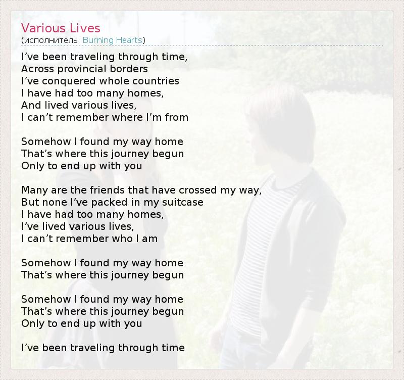 I’ve been traveling through time, Across provincial borders I’ve conquered whole countries I have had too many homes, And lived various lives, I can’t remember where I’m from Somehow I found my way home That’s where this journey begun Only to end up with you Many are the friends that have crossed my way, But none I’ve packed in my suitcase I have had too many homes, I’ve lived various lives, I can’t remember who I am Somehow I found my way home That’s where this journey begun Somehow I found my way home That’s where this journey begun Only to end up with you I’ve been traveling through time