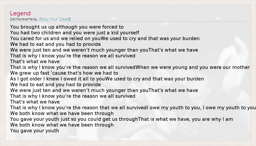 Это интересно:Американская команда «Bury Your Dead» родом из Ворчестера, штат Массачусетс. Коллектив был сформирован в 2001 году как сайд-проект участников metalcore-формации «Hamartia», а именно гитариста Брандана Слима Макдональда (Brendan “Slim” McDonald) и барабанщика Марка Кастилло (Mark Castillo). Доукомплектовав состав басистом Ричем Кэсри (Rich Casry, Groundzero) и вокалистом Джо Крюко (Joe Krewko), музыканты приступили к концертной деятельности... продолжение