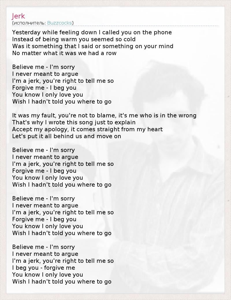 Yesterday while feeling down I called you on the phone Instead of being warm you seemed so cold Was it something that I said or something on your mind No matter what it was we had a row Believe me - I'm sorry I never meant to argue I'm a jerk, you're right to tell me so Forgive me - I beg you You know I only love you Wish I hadn't told you where to go It was my fault, you're not to blame, it's me who is in the wrong That's why I wrote this song just to explain Accept my apology, it comes straight from my heart Let's put it all behind us and move on Believe me - I'm sorry I never meant to argue I'm a jerk, you're right to tell me so Forgive me - I beg you You know I only love you Wish I hadn't told you where to go Believe me - I'm sorry I never meant to argue I'm a jerk, you're right to tell me so Forgive me - I beg you You know I only love you Wish I hadn't told you where to go Believe me - I'm sorry I never meant to argue I'm a jerk, you're right to tell me so I beg you - forgive me You know I only love you Wish I hadn't told you where to go