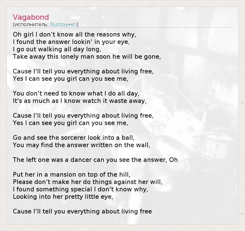 Ох, девчонка, мне неведомы причины, по которым Я нахожу ответы, заглядывая тебе в глаза. Весь день где-то бесцельно брожу. Забери с собой эту одинокую душу - Скоро от неё не останется и следа. Ведь я расскажу тебе всё о свободной жизни. Да, я вижу тебя, видишь ли ты меня? Тебе не нужно знать, чем я занят весь день, Насколько мне известно, Я просто наблюдаю за тем, как он проходит впустую. Ведь я расскажу тебе всё о свободной жизни. Да, я вижу тебя, видишь ли ты меня? Иди и взгляни на мага, смотрящего в шар, Возможно узнаешь о зловещих предзнаменованиях. Парень слева был танцор, ты знаешь ответ? Запри её во дворце на вершине холма, Только не заставляй её идти против своей воли. Я нашел в неё что-то необычное, не знаю что, Заглянув в её прекрасные маленькие глаза. Ведь я расскажу тебе всё о свободной жизни.