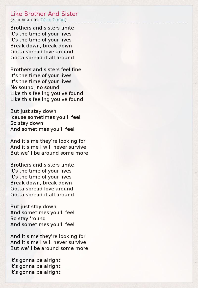 Братья и сёстры, объединяйтесь, Настало лучшее время ваших жизней, Настало лучшее время ваших жизней. Вырвитесь, вырвитесь И одаряйте любовью всех вокруг, Излучайте всю её вокруг себя! Братья и сёстры, почувствуйте себя хорошо, Настало лучшее время ваших жизней, Настало лучшее время ваших жизней. Без звука, без единого звука, Словно это найденное вами чувство, Словно это найденное вами чувство! Но просто останьтесь на своих местах, Потому что порой вы будете ощущать... Но просто останьтесь на своих местах, Потому что порой вы будете ощущать... И это я – тот, кого они ищут, И это я, и мне не выжить, Но мы продержимся ещё немного... Братья и сёстры, объединяйтесь, Настало лучшее время ваших жизней, Настало лучшее время ваших жизней. Вырвитесь, вырвитесь И одаряйте любовью всех вокруг, Излучайте всю её вокруг себя! Но просто останьтесь на своих местах, Потому что порой вы будете ощущать... Но просто останьтесь на своих местах, Потому что порой вы будете ощущать... И это я – тот, кого они ищут, И это я, и мне не выжить, Но мы продержимся ещё немного... Всё будет хорошо, Всё будет хорошо, Всё будет хорошо...