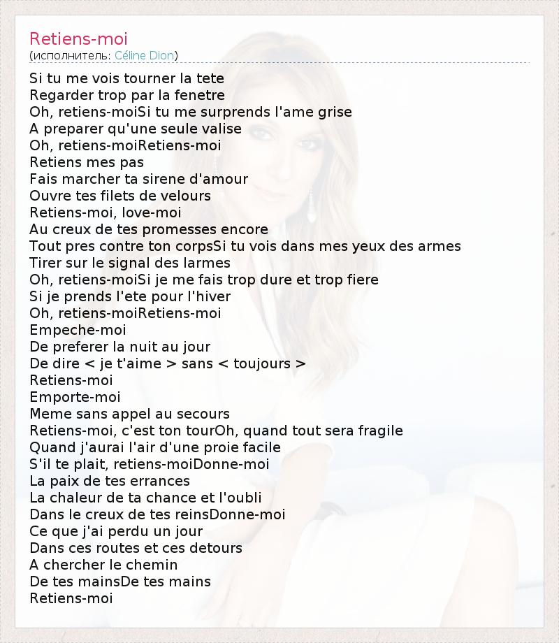 Si tu me vois tourner la tete Regarder trop par la fenetre Oh, retiens-moiSi tu me surprends l'ame grise A preparer qu'une seule valise Oh, retiens-moiRetiens-moi Retiens mes pas Fais marcher ta sirene d'amour Ouvre tes filets de velours Retiens-moi, love-moi Au creux de tes promesses encore Tout pres contre ton corpsSi tu vois dans mes yeux des armes Tirer sur le signal des larmes Oh, retiens-moiSi je me fais trop dure et trop fiere Si je prends l'ete pour l'hiver Oh, retiens-moiRetiens-moi Empeche-moi De preferer la nuit au jour De dire < je t'aime > sans < toujours > Retiens-moi Emporte-moi Meme sans appel au secours Retiens-moi, c'est ton tourOh, quand tout sera fragile Quand j'aurai l'air d'une proie facile S'il te plait, retiens-moiDonne-moi La paix de tes errances La chaleur de ta chance et l'oubli Dans le creux de tes reinsDonne-moi Ce que j'ai perdu un jour Dans ces routes et ces detours A chercher le chemin De tes mainsDe tes mains Retiens-moi