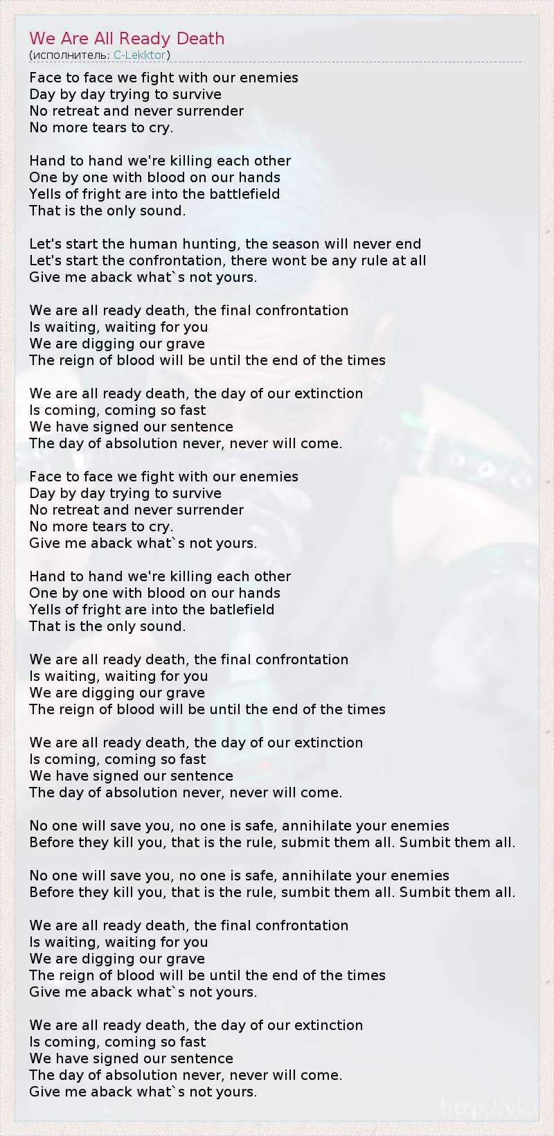 А как ты думаешь, о чем песня "We Are All Ready Death" ?