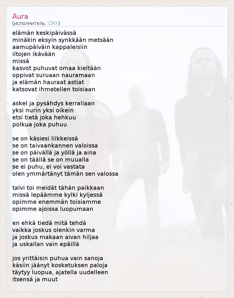 Это интересно:CMX (Cloaca Maxima) - финская рок-группа. В начале своей деятельности они исполняли песни на английском языке в стиле "hardcore punk", но позднее сместились в сторону мейнстрима со стихами на финском языке.На музыку CMX повлияли такие команды, как Rush, Yes и King Crimson. Влияние прогрессива особенно заметно на альбомах Dinosaurus Stereophonicus (2000) и Talvikuningas (2007).Постепенно CMX завоевали широкую популярность в... продолжение