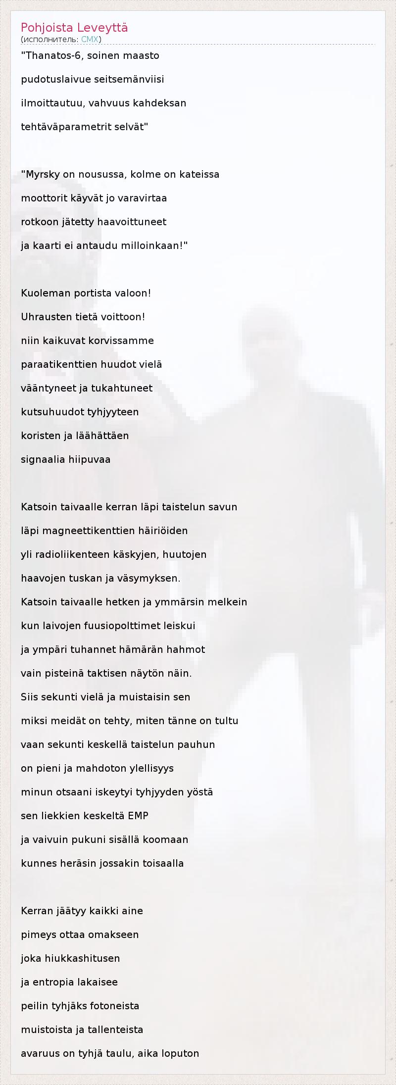 "Thanatos-6, soinen maasto pudotuslaivue seitsemänviisi ilmoittautuu, vahvuus kahdeksan tehtäväparametrit selvät" "Myrsky on nousussa, kolme on kateissa moottorit käyvät jo varavirtaa rotkoon jätetty haavoittuneet ja kaarti ei antaudu milloinkaan!" Kuoleman portista valoon! Uhrausten tietä voittoon! niin kaikuvat korvissamme paraatikenttien huudot vielä vääntyneet ja tukahtuneet kutsuhuudot tyhjyyteen koristen ja läähättäen signaalia hiipuvaa Katsoin taivaalle kerran läpi taistelun savun läpi magneettikenttien häiriöiden yli radioliikenteen käskyjen, huutojen haavojen tuskan ja väsymyksen. Katsoin taivaalle hetken ja ymmärsin melkein kun laivojen fuusiopolttimet leiskui ja ympäri tuhannet hämärän hahmot vain pisteinä taktisen näytön näin. Siis sekunti vielä ja muistaisin sen miksi meidät on tehty, miten tänne on tultu vaan sekunti keskellä taistelun pauhun on pieni ja mahdoton ylellisyys minun otsaani iskeytyi tyhjyyden yöstä sen liekkien keskeltä EMP ja vaivuin pukuni sisällä koomaan kunnes heräsin jossakin toisaalla Kerran jäätyy kaikki aine pimeys ottaa omakseen joka hiukkashitusen ja entropia lakaisee peilin tyhjäks fotoneista muistoista ja tallenteista avaruus on tyhjä taulu, aika loputon