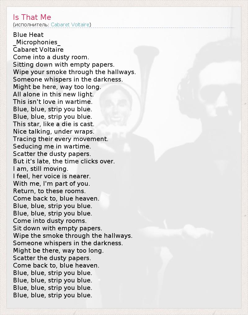 Blue Heat _Microphonies_ Cabaret Voltaire Come into a dusty room. Sitting down with empty papers. Wipe your smoke through the hallways. Someone whispers in the darkness. Might be here, way too long. All alone in this new light. This isn't love in wartime. Blue, blue, strip you blue. Blue, blue, strip you blue. This star, like a die is cast. Nice talking, under wraps. Tracing their every movement. Seducing me in wartime. Scatter the dusty papers. But it's late, the time clicks over. I am, still moving. I feel, her voice is nearer. With me, I'm part of you. Return, to these rooms. Come back to, blue heaven. Blue, blue, strip you blue. Blue, blue, strip you blue. Come into dusty rooms. Sit down with empty papers. Wipe the smoke through the hallways. Someone whispers in the darkness. Might be there, way too long. Scatter the dusty papers. Come back to, blue heaven. Blue, blue, strip you blue. Blue, blue, strip you blue. Blue, blue, strip you blue. Blue, blue, strip you blue.
