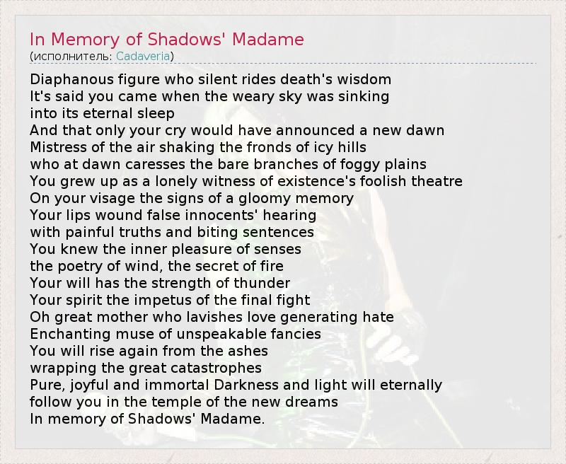 А как ты думаешь, о чем песня "In Memory of Shadows' Madame" ?