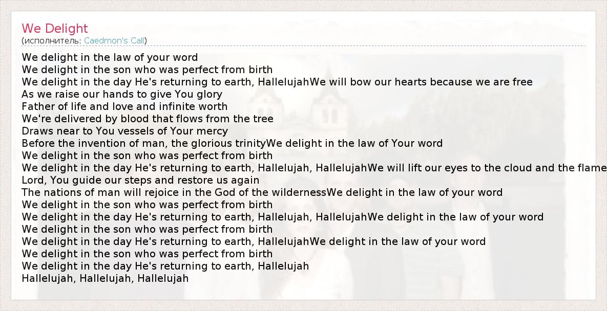 We delight in the day He's returning to earth, Hallelujah, HallelujahWe delight in the law of your word
