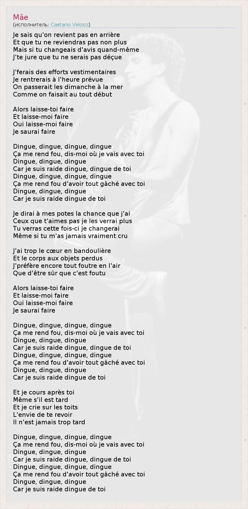 Это интересно:Каэтану Велозу - один из основателей музыкального течения 1960х годов "тропикализмо", популярный бразильский автор и певец. Тексты песен Каэтану Велозу сложны, условны и интересны, наряду с Шику Буарке он относится к числу наиболее талантливых и популярных современных португалоязычных поэтов-песенников. Каэтану Велозу родился 7 августа 1942 года в сельской местности Баия на северо-востоке... продолжение