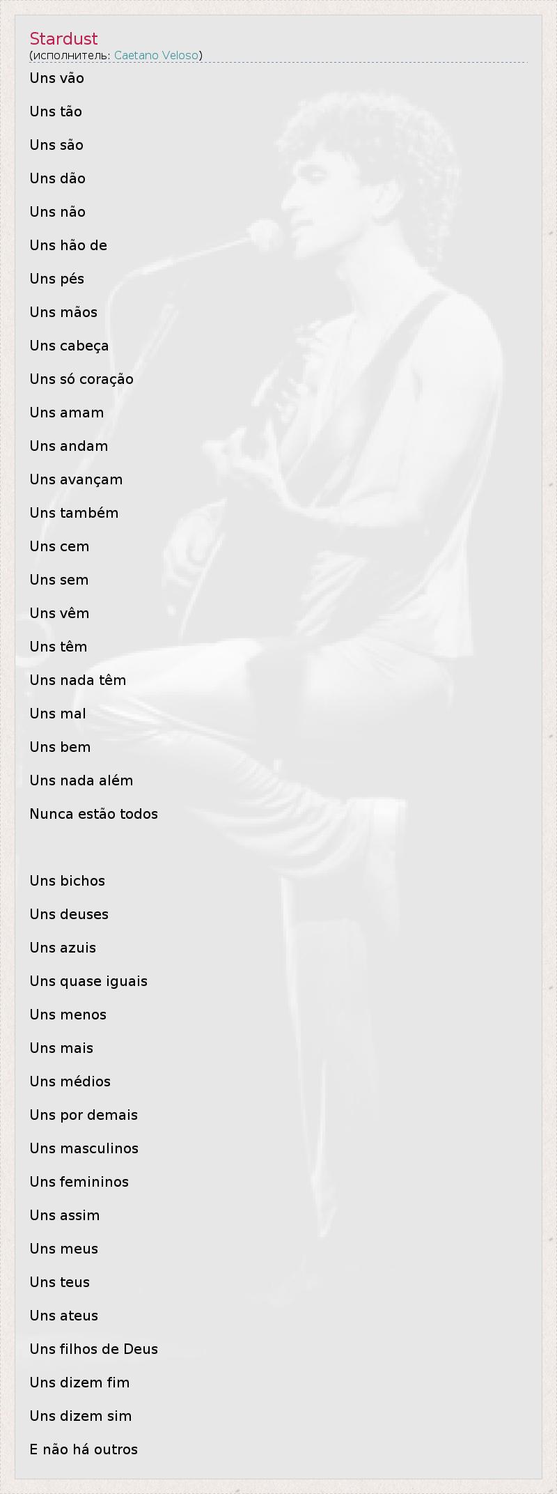 Это интересно:Каэтану Велозу - один из основателей музыкального течения 1960х годов "тропикализмо", популярный бразильский автор и певец. Тексты песен Каэтану Велозу сложны, условны и интересны, наряду с Шику Буарке он относится к числу наиболее талантливых и популярных современных португалоязычных поэтов-песенников. Каэтану Велозу родился 7 августа 1942 года в сельской местности Баия на северо-востоке... продолжение