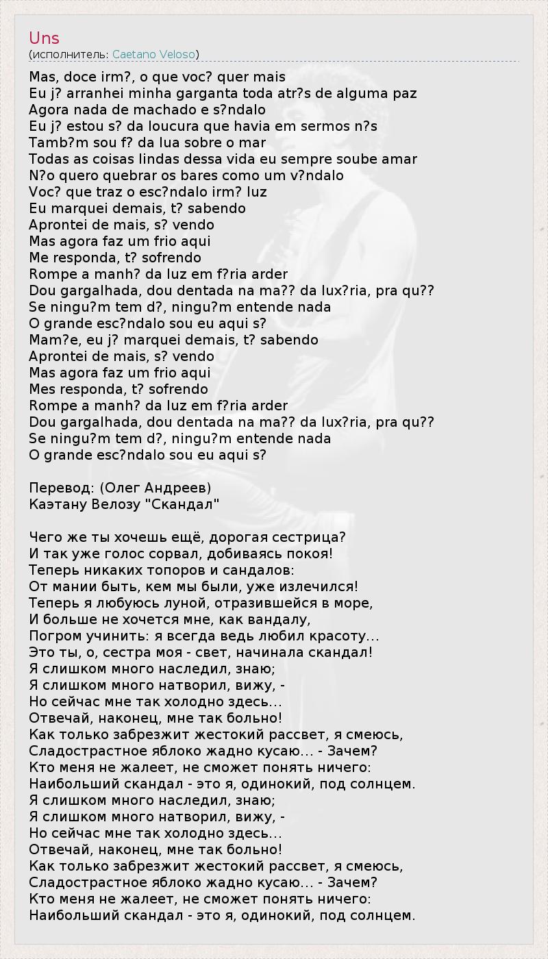 Это интересно:Каэтану Велозу - один из основателей музыкального течения 1960х годов "тропикализмо", популярный бразильский автор и певец. Тексты песен Каэтану Велозу сложны, условны и интересны, наряду с Шику Буарке он относится к числу наиболее талантливых и популярных современных португалоязычных поэтов-песенников. Каэтану Велозу родился 7 августа 1942 года в сельской местности Баия на северо-востоке... продолжение