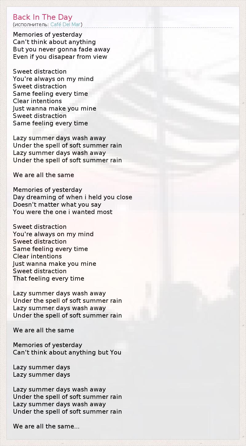 Memories of yesterday Can't think about anything But you never gonna fade away Even if you disapear from view Sweet distraction You're always on my mind Sweet distraction Same feeling every time Clear intentions Just wanna make you mine Sweet distraction Same feeling every time Lazy summer days wash away Under the spell of soft summer rain Lazy summer days wash away Under the spell of soft summer rain We are all the same Memories of yesterday Day dreaming of when i held you close Doesn't matter what you say You were the one i wanted most Sweet distraction You're always on my mind Sweet distraction Same feeling every time Clear intentions Just wanna make you mine Sweet distraction That feeling every time Lazy summer days wash away Under the spell of soft summer rain Lazy summer days wash away Under the spell of soft summer rain We are all the same Memories of yesterday Can't think about anything but You Lazy summer days Lazy summer days Lazy summer days wash away Under the spell of soft summer rain Lazy summer days wash away Under the spell of soft summer rain We are all the same...