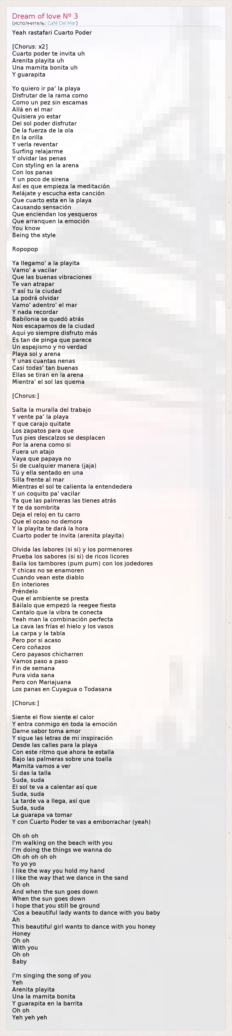 Да, растафарианцы Cuarto Poder. 1 [Припев: x2] Cuarto Poder приглашает тебя. У! Песочек, пляжик. У! Красивая мамочка. У! И винцо. 2 Я хочу пойти на пляж, Наслаждаться им, как, Как рыба без чешуи, Там, в море, Я хотел бы быть, Силой солнца наслаждаться, Силой волны На берегу И видеть, как она разбивается, Покататься на волне, расслабиться 3 И забыть о бедах, Играя на песке 4 С друзьями, И немного русалочек, Это так [хорошо], что я начинаю медитировать. Расслабься и слушай эту песню, Чётверки, которая находится на пляже 5 [И] вызывает чувство, Которая высекла огонь из кремня, 6 Которая даёт начало волнению. Ты знаешь. Будь стильным... Ро-по-поп... Мы уже пришли на пляжик, Давайте кутить, Ведь так хорошо кататься. Тебя поймали, А таков для тебя город - Невозможно забыть его, Всё глубже в море, И не помнить ничего. "Вавилон" остался позади, 7 Мы убегаем из города. Здесь я всегда больше наслаждаюсь, Вода так стекает, что это кажется Миражом и неправдой. Пляж, солнце и песок. И несколько девочек - Почти все такие хорошие - Они бросаются на песок Под палящим солнцем. 8 [Припев:] Перепрыгни крепостную стену работы И приди на пляж, И, парень, оставь Ботинки для того, чтобы Твои босые ноги поскользнулись На песке, как будто Шли кратчайшим путём. 9 Будешь папайю? Нет? Если каким бы то ни было образом (ха-ха) Ты и она остались наедине, Сидя напротив моря, Пока солнце согревает твой рассудок, Развлекай жестами, веселее! Ведь за тобой пальмы, И они дарят тебе небольшую тень, Оставь часы в своём автомобиле, Они закат не задержат, А пляжик даст тебе час, Cuarto Poder приглашает тебя... (песочек, пляжик) Забудь работу (да, да) и мелочи, Попробуй на вкус (да, да) очень вкусные ликеры, Танцуй под барабаны (бум, бум) с шутниками, А девушки не влюбляются, Когда видят этого дьявола Внутри. Очаруй её, Ведь окружающая обстановка даёт основание, Танцуй под это, ведь начался праздник регги, 10 Спой это, ведь вибрация тебя охватывает, Да, мужик, совершенная комбинация: Винный погреб, холодные лёд и стаканы, Тент на пляже и доска, Но в таком случае Ноль печалей, 11 Ноль трещащих клоунов. Мы идем шаг за шагом К выходным, 12 Чистая здоровая жизнь, Но с марихуаной, 13 Буйки в Cuyagua или Todasana. 14 [Припев:] Почувствуй прилив, почувствуй тепло И почувствуй со мной каждую эмоцию, Дай мне [почувствовать] вкус, возьми любовь И следуй букве моего вдохновения: С улиц на пляж С этим ритмом, который сейчас тебя взорвёт, Под пальмами только в полотенце. Мамочка, посмотрим... Если тебе надоело, Потей, потей! Солнце будет согревать тебя, так что Потей, потей! Вечер наступит, так что Потей, потей! Вино почувствуется, И с Cuarto Poder ты напьёшься. (е-а) О-о-о. Я гуляю по пляжу с тобой, Я делаю то, что мы хотим делать. О-о-о-о-о. Я, я, я. Мне нравится, как ты держишь меня за руку, Мне нравится, как мы танцуем на песке. О-о. А когда солнце садится, Когда солнце садится, Я надеюсь, что ты всё ещё на земле, Ведь красивая леди хочет танцевать с её малышом. Ах! Эта красивая девушка хочет танцевать с её милым. Милый. О-о. С тобой. О-о. Малыш. Я пою песню о тебе. Е-а. Песочек, пляжик, Красивая мамочка И винцо в маленьком баре. О-о. Да, да, да. 1 – растафарианство (rastafari) — религия, возникшая в христианской культуре на Ямайке в 1930-х годах, которая привела к образованию музыкального стиля регги в 1960-х. Его сторонники называются растаманами. Основа растафарианства — любовь к ближнему и отказ от западного обществ