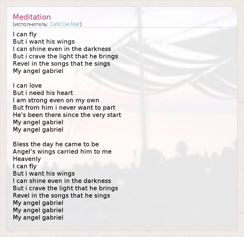 I can fly But i want his wings I can shine even in the darkness But i crave the light that he brings Revel in the songs that he sings My angel gabriel I can love But i need his heart I am strong even on my own But from him i never want to part He's been there since the very start My angel gabriel My angel gabriel Bless the day he came to be Angel's wings carried him to me Heavenly I can fly But i want his wings I can shine even in the darkness But i crave the light that he brings Revel in the songs that he sings My angel gabriel My angel gabriel My angel gabriel