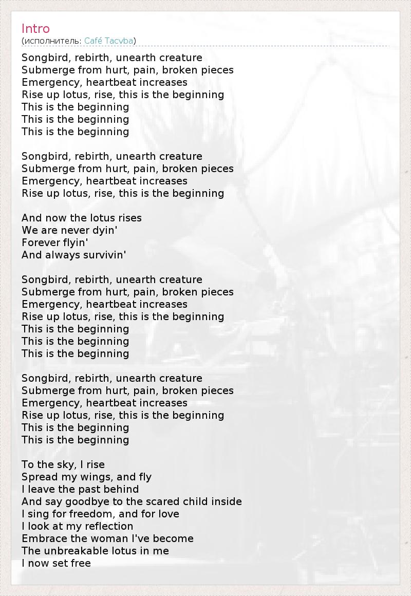 Певчие птицы, возрождение, неземное творение, Прячьтесь от страданий, боли и ссор, Критическое положение учащает сердцебиение, Расцветай, лотос, расти, это начало, Это начало, Это начало, Это начало... Певчие птицы, возрождение, неземное творение, Прячьтесь от страданий, боли и ссор, Критическое положение учащает сердцебиение, Расцветай, лотос, расти, это начало... А теперь лотос распускается, И мы никогда не умрём, Мы в вечном полёте, Мы всегда выживаем. Певчие птицы, возрождение, неземное творение, Прячьтесь от страданий, боли и ссор, Критическое положение учащает сердцебиение, Расцветай, лотос, расти, это начало, Это начало, Это начало, Это начало... Певчие птицы, возрождение, неземное творение, Прячьтесь от страданий, боли и ссор, Критическое положение учащает сердцебиение, Расцветай, лотос, расти, это начало, Это начало, Это начало... К небесам я взмываю, Расправляю свои крылья и лечу, Оставляю прошлое позади, Прощаюсь с испуганным ребёнком внутри, Я пою о свободе и о любви, Я смотрю на своё отражение, Любуюсь женщиной, которой я стала. Во мне несокрушимый лотос, И теперь я свободна.