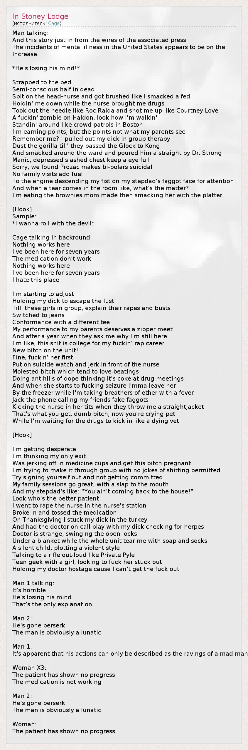 Это интересно:1. Cage — это детские воспоминания, ужасающие воображение; это основательное злоупотребление наркотиками; психическое расстройство, параноидальные, депрессивные и суицидальные наклонности, психиатрическая лечебница — таков осадок, что на дне его глубочайших и трогательных рифм. Радикальная, завораживающая, искренняя, нестандартная личность уже давно вернулась к музыке и даёт возможность... продолжение
