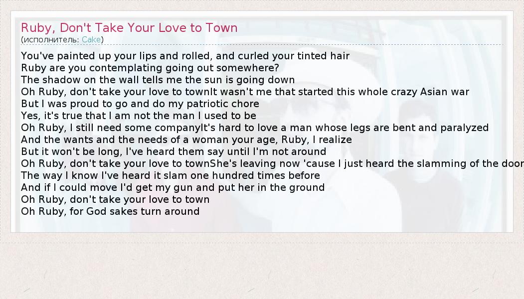 А как ты думаешь, о чем песня "Ruby, Don't Take Your Love to Town" ?