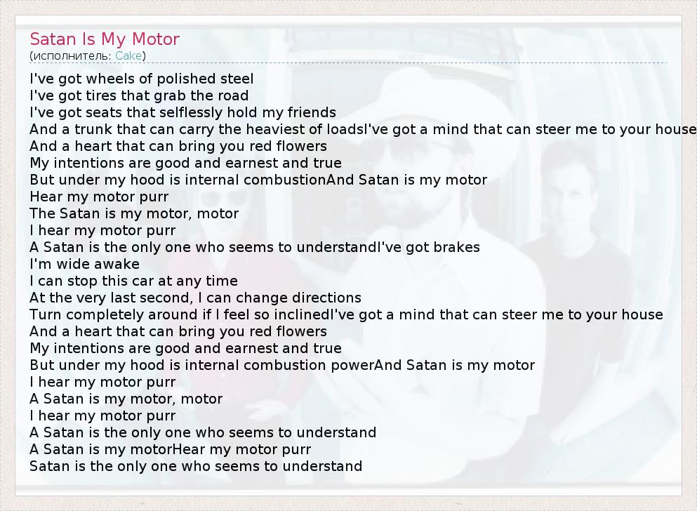 I've got wheels of polished steel I've got tires that grab the road I've got seats that selflessly hold my friends And a trunk that can carry the heaviest of loadsI've got a mind that can steer me to your house And a heart that can bring you red flowers My intentions are good and earnest and true But under my hood is internal combustionAnd Satan is my motor Hear my motor purr The Satan is my motor, motor I hear my motor purr A Satan is the only one who seems to understandI've got brakes I'm wide awake I can stop this car at any time At the very last second, I can change directions Turn completely around if I feel so inclinedI've got a mind that can steer me to your house And a heart that can bring you red flowers My intentions are good and earnest and true But under my hood is internal combustion powerAnd Satan is my motor I hear my motor purr A Satan is my motor, motor I hear my motor purr A Satan is the only one who seems to understand A Satan is my motorHear my motor purr Satan is the only one who seems to understand