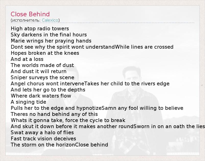 Это интересно:Calexico — современный американский музыкальный коллектив, играющий альтернативное кантри с заметным влиянием мексиканских и латиноамериканских мотивов. Группа была образована в 1996 году вокалистом и гитаристом Джоуи Бёрнсом и барабанщиком Джоном Конвертино в городе Таксон штата Аризона.Текущий состав:Джоуи Бёрнс (Joey Burns) — вокал, гитараДжон Конвертино (John Convertino) — ударные... продолжение