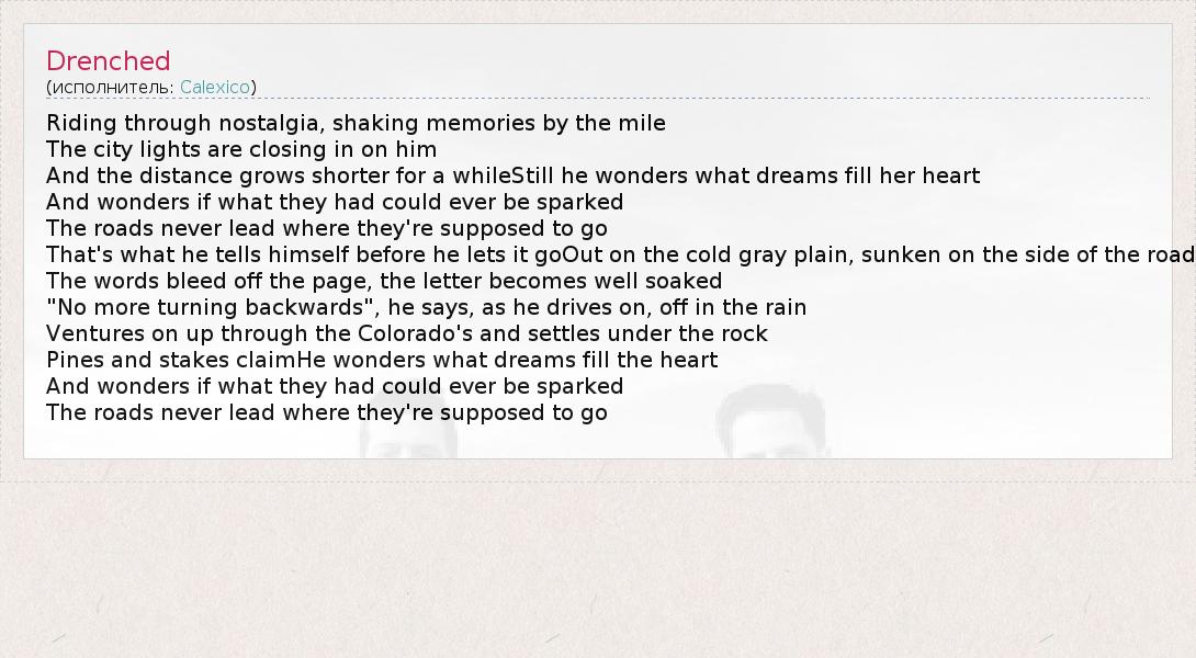 Это интересно:Calexico — современный американский музыкальный коллектив, играющий альтернативное кантри с заметным влиянием мексиканских и латиноамериканских мотивов. Группа была образована в 1996 году вокалистом и гитаристом Джоуи Бёрнсом и барабанщиком Джоном Конвертино в городе Таксон штата Аризона.Текущий состав:Джоуи Бёрнс (Joey Burns) — вокал, гитараДжон Конвертино (John Convertino) — ударные... продолжение