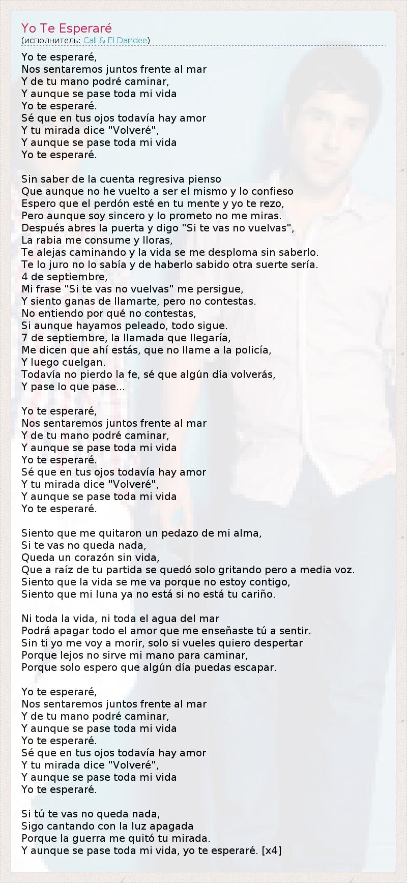 Yo te esperaré, Nos sentaremos juntos frente al mar Y de tu mano podré caminar, Y aunque se pase toda mi vida Yo te esperaré. Sé que en tus ojos todavía hay amor Y tu mirada dice "Volveré", Y aunque se pase toda mi vida Yo te esperaré. Sin saber de la cuenta regresiva pienso Que aunque no he vuelto a ser el mismo y lo confieso Espero que el perdón esté en tu mente y yo te rezo, Pero aunque soy sincero y lo prometo no me miras. Después abres la puerta y digo "Si te vas no vuelvas", La rabia me consume y lloras, Te alejas caminando y la vida se me desploma sin saberlo. Te lo juro no lo sabía y de haberlo sabido otra suerte sería. 4 de septiembre, Mi frase "Si te vas no vuelvas" me persigue, Y siento ganas de llamarte, pero no contestas. No entiendo por qué no contestas, Si aunque hayamos peleado, todo sigue. 7 de septiembre, la llamada que llegaría, Me dicen que ahí estás, que no llame a la policía, Y luego cuelgan. Todavía no pierdo la fe, sé que algún día volverás, Y pase lo que pase... Yo te esperaré, Nos sentaremos juntos frente al mar Y de tu mano podré caminar, Y aunque se pase toda mi vida Yo te esperaré. Sé que en tus ojos todavía hay amor Y tu mirada dice "Volveré", Y aunque se pase toda mi vida Yo te esperaré. Siento que me quitaron un pedazo de mi alma, Si te vas no queda nada, Queda un corazón sin vida, Que a raíz de tu partida se quedó solo gritando pero a media voz. Siento que la vida se me va porque no estoy contigo, Siento que mi luna ya no está si no está tu cariño. Ni toda la vida, ni toda el agua del mar Podrá apagar todo el amor que me enseñaste tú a sentir. Sin ti yo me voy a morir, solo si vueles quiero despertar Porque lejos no sirve mi mano para caminar, Porque solo espero que algún día puedas escapar. Yo te esperaré, Nos sentaremos juntos frente al mar Y de tu mano podré caminar, Y aunque se pase toda mi vida Yo te esperaré. Sé que en tus ojos todavía hay amor Y tu mirada dice "Volveré", Y aunque se pase toda mi vida Yo te esperaré. Si tú te vas no queda nada, Sigo cantando con la luz apagada Porque la guerra me quitó tu mirada. Y aunque se pase toda mi vida, yo te esperaré. [x4]