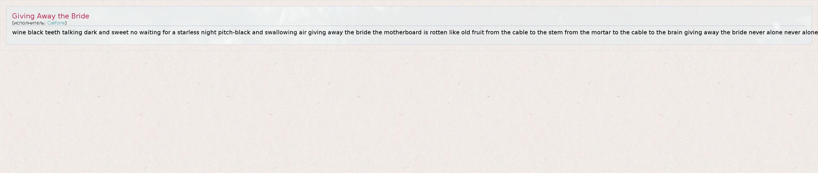 wine black teeth talking dark and sweet no waiting for a starless night pitch-black and swallowing air giving away the bride the motherboard is rotten like old fruit from the cable to the stem from the mortar to the cable to the brain giving away the bride never alone never alone