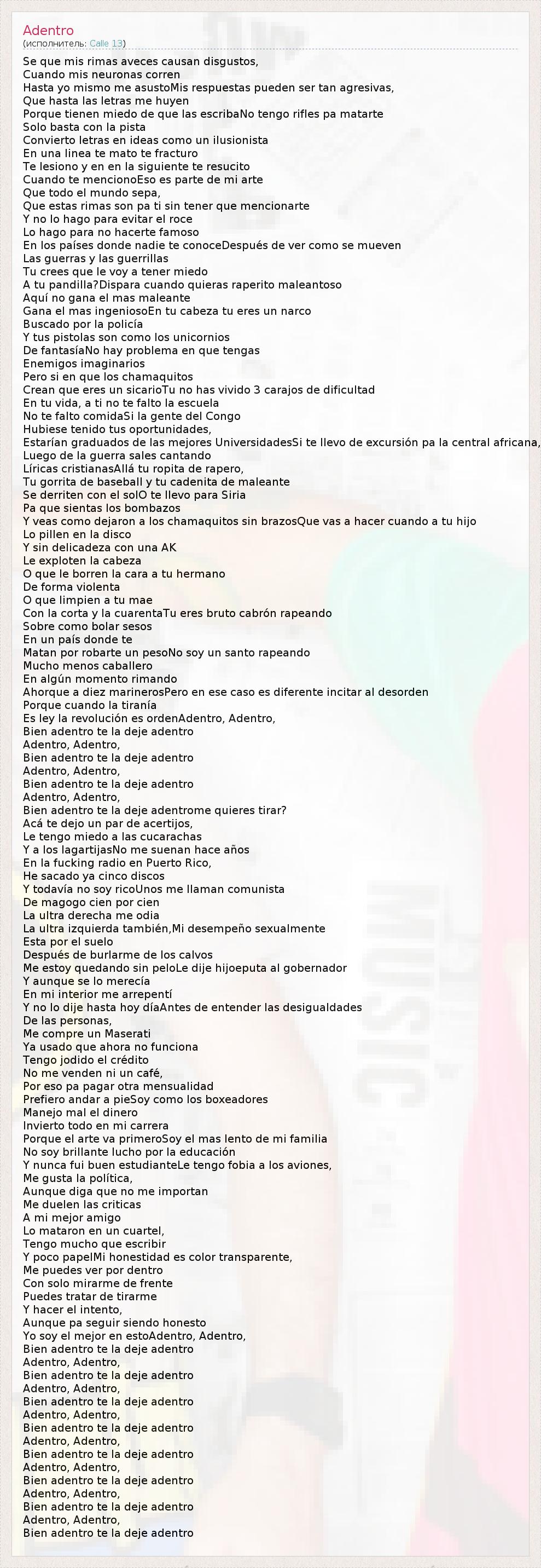 Se que mis rimas aveces causan disgustos, Cuando mis neuronas corren Hasta yo mismo me asustoMis respuestas pueden ser tan agresivas, Que hasta las letras me huyen Porque tienen miedo de que las escribaNo tengo rifles pa matarte Solo basta con la pista Convierto letras en ideas como un ilusionista En una linea te mato te fracturo Te lesiono y en en la siguiente te resucito Cuando te mencionoEso es parte de mi arte Que todo el mundo sepa, Que estas rimas son pa ti sin tener que mencionarte Y no lo hago para evitar el roce Lo hago para no hacerte famoso En los países donde nadie te conoceDespués de ver como se mueven Las guerras y las guerrillas Tu crees que le voy a tener miedo A tu pandilla?Dispara cuando quieras raperito maleantoso Aquí no gana el mas maleante Gana el mas ingeniosoEn tu cabeza tu eres un narco Buscado por la policía Y tus pistolas son como los unicornios De fantasíaNo hay problema en que tengas Enemigos imaginarios Pero si en que los chamaquitos Crean que eres un sicarioTu no has vivido 3 carajos de dificultad En tu vida, a ti no te falto la escuela No te falto comidaSi la gente del Congo Hubiese tenido tus oportunidades, Estarían graduados de las mejores UniversidadesSi te llevo de excursión pa la central africana, Luego de la guerra sales cantando Líricas cristianasAllá tu ropita de rapero, Tu gorrita de baseball y tu cadenita de maleante Se derriten con el solO te llevo para Siria Pa que sientas los bombazos Y veas como dejaron a los chamaquitos sin brazosQue vas a hacer cuando a tu hijo Lo pillen en la disco Y sin delicadeza con una AK Le exploten la cabeza O que le borren la cara a tu hermano De forma violenta O que limpien a tu mae Con la corta y la cuarentaTu eres bruto cabrón rapeando Sobre como bolar sesos En un país donde te Matan por robarte un pesoNo soy un santo rapeando Mucho menos caballero En algún momento rimando Ahorque a diez marinerosPero en ese caso es diferente incitar al desorden Porque cuando la tiranía Es ley la revolución es ordenAdentro, Adentro, Bien adentro te la deje adentro Adentro, Adentro, Bien adentro te la deje adentro Adentro, Adentro, Bien adentro te la deje adentro Adentro, Adentro, Bien adentro te la deje adentrome quieres tirar? Acá te dejo un par de acertijos, Le tengo miedo a las cucarachas Y a los lagartijasNo me suenan hace años En la fucking radio en Puerto Rico, He sacado ya cinco discos Y todavía no soy ricoUnos me llaman comunista De magogo cien por cien La ultra derecha me odia La ultra izquierda también,Mi desempeño sexualmente Esta por el suelo Después de burlarme de los calvos Me estoy quedando sin peloLe dije hijoeputa al gobernador Y aunque se lo merecía En mi interior me arrepentí Y no lo dije hasta hoy díaAntes de entender las desigualdades De las personas, Me compre un Maserati Ya usado que ahora no funciona Tengo jodido el crédito No me venden ni un café, Por eso pa pagar otra mensualidad Prefiero andar a pieSoy como los boxeadores Manejo mal el dinero Invierto todo en mi carrera Porque el arte va primeroSoy el mas lento de mi familia No soy brillante lucho por la educación Y nunca fui buen estudianteLe tengo fobia a los aviones, Me gusta la política, Aunque diga que no me importan Me duelen las criticas A mi mejor amigo Lo mataron en un cuartel, Tengo mucho que escribir Y poco papelMi honestidad es color transparente, Me puedes ver por dentro Con solo mirarme de frente Puedes tratar de tirarme Y hacer el intento, Aunque pa seguir siendo honesto Yo soy el mejor en estoAdentro, Adentro, Bien adentro te la deje adentro Adentro, Adentro, Bien adentro te la deje adentro Adentro, Adentro, Bien adentro te la deje adentro Adentro, Adentro, Bien adentro te la deje adentro Adentro, Adentro, Bien adentro te la deje adentro Adentro, Adentro, Bien adentro te la deje adentro Adentro, Adentro, Bien adentro te la deje adentro Adentro, Adentro, Bien adentro te la deje adentro