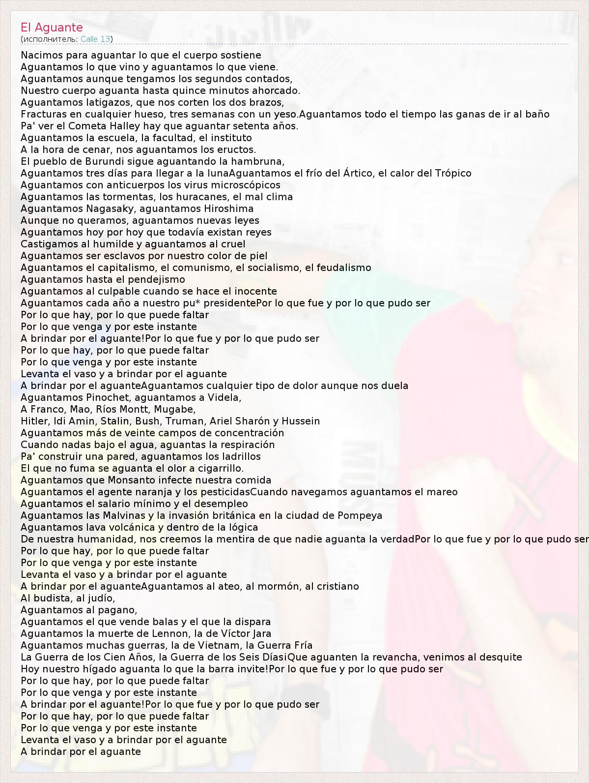 Nacimos para aguantar lo que el cuerpo sostiene Aguantamos lo que vino y aguantamos lo que viene. Aguantamos aunque tengamos los segundos contados, Nuestro cuerpo aguanta hasta quince minutos ahorcado. Aguantamos latigazos, que nos corten los dos brazos, Fracturas en cualquier hueso, tres semanas con un yeso.Aguantamos todo el tiempo las ganas de ir al baño Pa' ver el Cometa Halley hay que aguantar setenta años. Aguantamos la escuela, la facultad, el instituto A la hora de cenar, nos aguantamos los eructos. El pueblo de Burundi sigue aguantando la hambruna, Aguantamos tres días para llegar a la lunaAguantamos el frío del Ártico, el calor del Trópico Aguantamos con anticuerpos los virus microscópicos Aguantamos las tormentas, los huracanes, el mal clima Aguantamos Nagasaky, aguantamos Hiroshima Aunque no queramos, aguantamos nuevas leyes Aguantamos hoy por hoy que todavía existan reyes Castigamos al humilde y aguantamos al cruel Aguantamos ser esclavos por nuestro color de piel Aguantamos el capitalismo, el comunismo, el socialismo, el feudalismo Aguantamos hasta el pendejismo Aguantamos al culpable cuando se hace el inocente Aguantamos cada año a nuestro pu* presidentePor lo que fue y por lo que pudo ser Por lo que hay, por lo que puede faltar Por lo que venga y por este instante A brindar por el aguante!Por lo que fue y por lo que pudo ser Por lo que hay, por lo que puede faltar Por lo que venga y por este instante Levanta el vaso y a brindar por el aguante A brindar por el aguanteAguantamos cualquier tipo de dolor aunque nos duela Aguantamos Pinochet, aguantamos a Videla, A Franco, Mao, Ríos Montt, Mugabe, Hitler, Idi Amin, Stalin, Bush, Truman, Ariel Sharón y Hussein Aguantamos más de veinte campos de concentración Cuando nadas bajo el agua, aguantas la respiración Pa' construir una pared, aguantamos los ladrillos El que no fuma se aguanta el olor a cigarrillo. Aguantamos que Monsanto infecte nuestra comida Aguantamos el agente naranja y los pesticidasCuando navegamos aguantamos el mareo Aguantamos el salario mínimo y el desempleo Aguantamos las Malvinas y la invasión británica en la ciudad de Pompeya Aguantamos lava volcánica y dentro de la lógica De nuestra humanidad, nos creemos la mentira de que nadie aguanta la verdadPor lo que fue y por lo que pudo ser Por lo que hay, por lo que puede faltar Por lo que venga y por este instante Levanta el vaso y a brindar por el aguante A brindar por el aguanteAguantamos al ateo, al mormón, al cristiano Al budista, al judío, Aguantamos al pagano, Aguantamos el que vende balas y el que la dispara Aguantamos la muerte de Lennon, la de Víctor Jara Aguantamos muchas guerras, la de Vietnam, la Guerra Fría La Guerra de los Cien Años, la Guerra de los Seis Días¡Que aguanten la revancha, venimos al desquite Hoy nuestro hígado aguanta lo que la barra invite!Por lo que fue y por lo que pudo ser Por lo que hay, por lo que puede faltar Por lo que venga y por este instante A brindar por el aguante!Por lo que fue y por lo que pudo ser Por lo que hay, por lo que puede faltar Por lo que venga y por este instante Levanta el vaso y a brindar por el aguante A brindar por el aguante