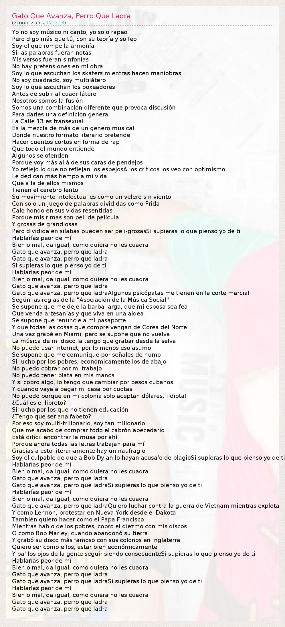 Yo no soy músico ni canto, yo solo rapeo Pero digo más que tú, con su teoría y solfeo Soy el que rompe la armonía Si las palabras fueran notas Mis versos fueran sinfonías No hay pretensiones en mi obra Soy lo que escuchan los skaters mientras hacen maniobras No soy cuadrado, soy multilátero Soy lo que escuchan los boxeadores Antes de subir al cuadrilátero Nosotros somos la fusión Somos una combinación diferente que provoca discusión Para darles una definición general La Calle 13 es transexual Es la mezcla de más de un genero musical Donde nuestro formato literario pretende Hacer cuentos cortos en forma de rap Que todo el mundo entiende Algunos se ofenden Porque voy más allá de sus caras de pendejos Yo reflejo lo que no reflejan los espejosA los críticos los veo con optimismo Le dedican más tiempo a mi vida Que a la de ellos mismos Tienen el cerebro lento Su movimiento intelectual es como un velero sin viento Con solo un juego de palabras divididas como Frida Calo hondo en sus vidas resentidas Porque mis rimas son peli de película Y grosas de grandiosas Pero dividida en silabas pueden ser peli-grosasSi supieras lo que pienso yo de ti Hablarías peor de mí Bien o mal, da igual, como quiera no les cuadra Gato que avanza, perro que ladra Gato que avanza, perro que ladra Si supieras lo que pienso yo de ti Hablarías peor de mí Bien o mal, da igual, como quiera no les cuadra Gato que avanza, perro que ladra Gato que avanza, perro que ladraAlgunos psicópatas me tienen en la corte marcial Según las reglas de la "Asociación de la Música Social" Se supone que me deje la barba larga, que mi esposa sea fea Que venda artesanías y que viva en una aldea Se supone que renuncie a mi pasaporte Y que todas las cosas que compre vengan de Corea del Norte Una vez grabé en Miami, pero se supone que no vuelva La música de mi disco la tengo que grabar desde la selva No puedo usar internet, por lo menos eso asumo Se supone que me comunique por señales de humo Si lucho por los pobres, económicamente los de abajo No puedo cobrar por mi trabajo No puedo tener plata en mis manos Y si cobro algo, lo tengo que cambiar por pesos cubanos Y cuando vaya a pagar mi casa por cuotas No puedo porque en mi colonia solo aceptan dólares, ¡Idiota! ¿Cuál es el libreto? Si lucho por los que no tienen educación ¿Tengo que ser analfabeto? Por eso soy multi-trillonario, soy tan millonario Que me acabo de comprar todo el cabrón abecedario Está difícil encontrar la musa por ahí Porque ahora todas las letras trabajan para mí Gracias a esto literariamente hay un naufragio Soy el culpable de que a Bob Dylan lo hayan acusa'o de plagioSi supieras lo que pienso yo de ti Hablarías peor de mí Bien o mal, da igual, como quiera no les cuadra Gato que avanza, perro que ladra Gato que avanza, perro que ladraSi supieras lo que pienso yo de ti Hablarías peor de mí Bien o mal, da igual, como quiera no les cuadra Gato que avanza, perro que ladraQuiero luchar contra la guerra de Vietnam mientras explota Y como Lennon, protestar en Nueva York desde el Dakota También quiero hacer como el Papa Francisco Mientras hablo de los pobres, cobro el diezmo con mis discos O como Bob Marley, cuando abandonó su tierra Y grabó su disco más famoso con sus colonos en Inglaterra Quiero ser como ellos, estar bien económicamente Y pa' los ojos de la gente seguir siendo consecuenteSi supieras lo que pienso yo de ti Hablarías peor de mí Bien o mal, da igual, como quiera no les cuadra Gato que avanza, perro que ladra Gato que avanza, perro que ladraSi supieras lo que pienso yo de ti Hablarías peor de mí Bien o mal, da igual, como quiera no les cuadra Gato que avanza, perro que ladra Gato que avanza, perro que ladra