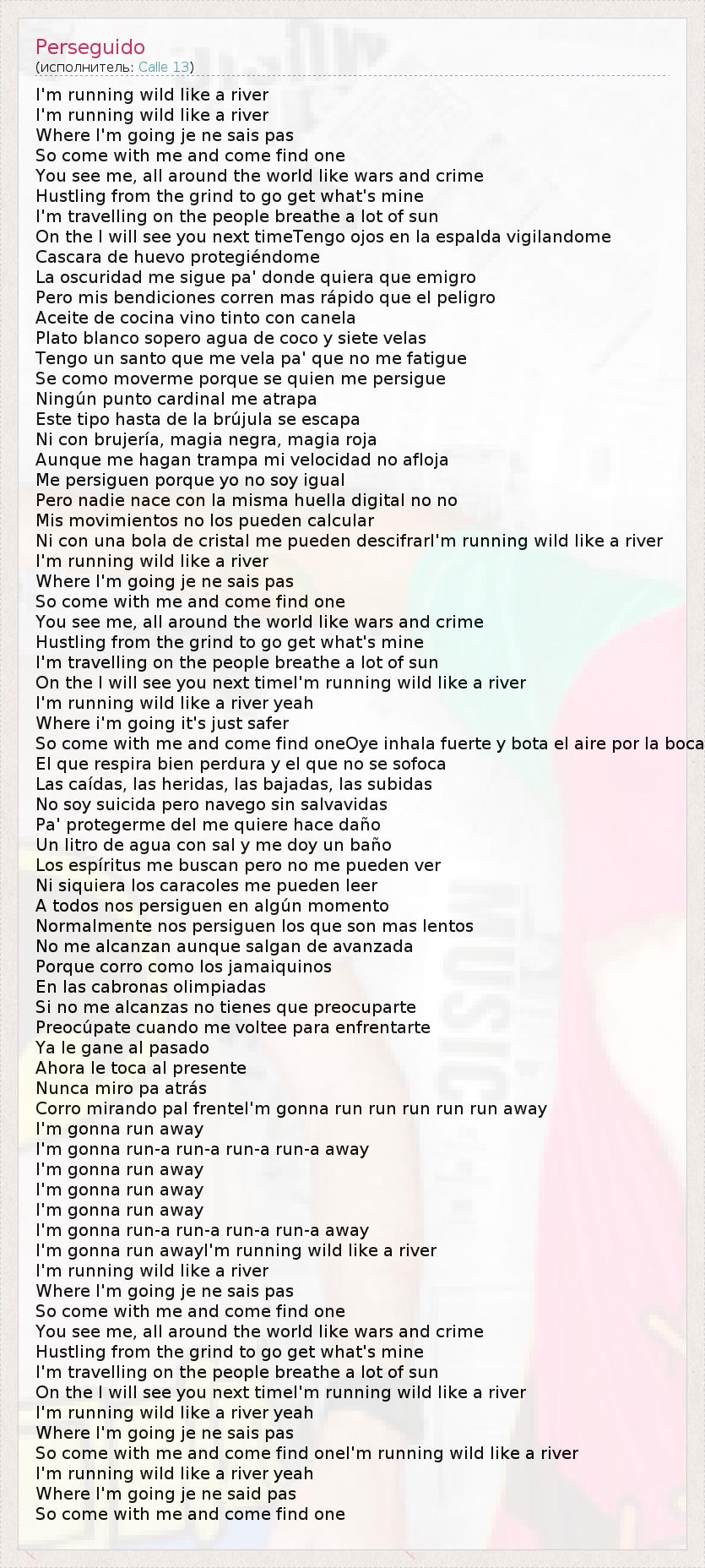 I'm running wild like a river I'm running wild like a river Where I'm going je ne sais pas So come with me and come find one You see me, all around the world like wars and crime Hustling from the grind to go get what's mine I'm travelling on the people breathe a lot of sun On the I will see you next timeTengo ojos en la espalda vigilandome Cascara de huevo protegiéndome La oscuridad me sigue pa' donde quiera que emigro Pero mis bendiciones corren mas rápido que el peligro Aceite de cocina vino tinto con canela Plato blanco sopero agua de coco y siete velas Tengo un santo que me vela pa' que no me fatigue Se como moverme porque se quien me persigue Ningún punto cardinal me atrapa Este tipo hasta de la brújula se escapa Ni con brujería, magia negra, magia roja Aunque me hagan trampa mi velocidad no afloja Me persiguen porque yo no soy igual Pero nadie nace con la misma huella digital no no Mis movimientos no los pueden calcular Ni con una bola de cristal me pueden descifrarI'm running wild like a river I'm running wild like a river Where I'm going je ne sais pas So come with me and come find one You see me, all around the world like wars and crime Hustling from the grind to go get what's mine I'm travelling on the people breathe a lot of sun On the I will see you next timeI'm running wild like a river I'm running wild like a river yeah Where i'm going it's just safer So come with me and come find oneOye inhala fuerte y bota el aire por la boca El que respira bien perdura y el que no se sofoca Las caídas, las heridas, las bajadas, las subidas No soy suicida pero navego sin salvavidas Pa' protegerme del me quiere hace daño Un litro de agua con sal y me doy un baño Los espíritus me buscan pero no me pueden ver Ni siquiera los caracoles me pueden leer A todos nos persiguen en algún momento Normalmente nos persiguen los que son mas lentos No me alcanzan aunque salgan de avanzada Porque corro como los jamaiquinos En las cabronas olimpiadas Si no me alcanzas no tienes que preocuparte Preocúpate cuando me voltee para enfrentarte Ya le gane al pasado Ahora le toca al presente Nunca miro pa atrás Corro mirando pal frenteI'm gonna run run run run run away I'm gonna run away I'm gonna run-a run-a run-a run-a away I'm gonna run away I'm gonna run away I'm gonna run away I'm gonna run-a run-a run-a run-a away I'm gonna run awayI'm running wild like a river I'm running wild like a river Where I'm going je ne sais pas So come with me and come find one You see me, all around the world like wars and crime Hustling from the grind to go get what's mine I'm travelling on the people breathe a lot of sun On the I will see you next timeI'm running wild like a river I'm running wild like a river yeah Where I'm going je ne sais pas So come with me and come find oneI'm running wild like a river I'm running wild like a river yeah Where I'm going je ne said pas So come with me and come find one