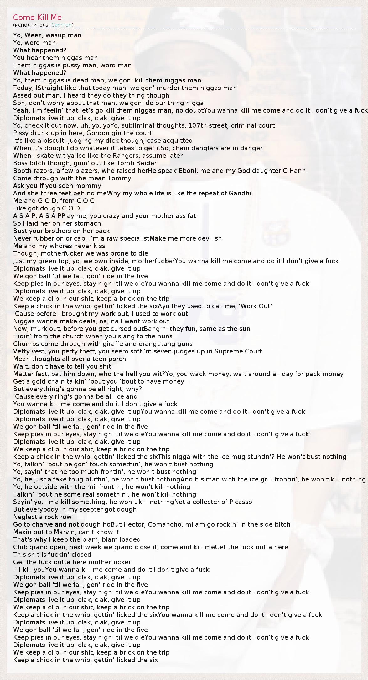 Yo, Weez, wasup man Yo, word man What happened? You hear them niggas man Them niggas is pussy man, word man What happened? Yo, them niggas is dead man, we gon' kill them niggas man Today, IStraight like that today man, we gon' murder them niggas man Assed out man, I heard they do they thing though Son, don't worry about that man, we gon' do our thing nigga Yeah, I'm feelin' that let's go kill them niggas man, no doubtYou wanna kill me come and do it I don't give a fuck Diplomats live it up, clak, clak, give it up Yo, check it out now, uh, yo, yoYo, subliminal thoughts, 107th street, criminal court Pissy drunk up in here, Gordon gin the court It's like a biscuit, judging my dick though, case acquitted When it's dough I do whatever it takes to get itSo, chain danglers are in danger When I skate wit ya ice like the Rangers, assume later Boss bitch though, goin' out like Tomb Raider Booth razors, a few blazers, who raised herHe speak Eboni, me and my God daughter C-Hanni Come through with the mean Tommy Ask you if you seen mommy And she three feet behind meWhy my whole life is like the repeat of Gandhi Me and G O D, from C O C Like got dough C O D A S A P, A S A PPlay me, you crazy and your mother ass fat So I laid her on her stomach Bust your brothers on her back Never rubber on or cap, I'm a raw specialistMake me more devilish Me and my whores never kiss Though, motherfucker we was prone to die Just my green top, yo, we own inside, motherfuckerYou wanna kill me come and do it I don't give a fuck Diplomats live it up, clak, clak, give it up We gon ball 'til we fall, gon' ride in the five Keep pies in our eyes, stay high 'til we dieYou wanna kill me come and do it I don't give a fuck Diplomats live it up, clak, clak, give it up We keep a clip in our shit, keep a brick on the trip Keep a chick in the whip, gettin' licked the sixAyo they used to call me, 'Work Out' 'Cause before I brought my work out, I used to work out Niggas wanna make deals, na, na I want work out Now, murk out, before you get cursed outBangin' they fun, same as the sun Hidin' from the church when you slang to the nuns Chumps come through with giraffe and orangutang guns Vetty vest, you petty theft, you seem softI'm seven judges up in Supreme Court Mean thoughts all over a teen porch Wait, don't have to tell you shit Matter fact, pat him down, who the hell you wit?Yo, you wack money, wait around all day for pack money Get a gold chain talkin' 'bout you 'bout to have money But everything's gonna be all right, why? 'Cause every ring's gonna be all ice and You wanna kill me come and do it I don't give a fuck Diplomats live it up, clak, clak, give it upYou wanna kill me come and do it I don't give a fuck Diplomats live it up, clak, clak, give it up We gon ball 'til we fall, gon' ride in the five Keep pies in our eyes, stay high 'til we dieYou wanna kill me come and do it I don't give a fuck Diplomats live it up, clak, clak, give it up We keep a clip in our shit, keep a brick on the trip Keep a chick in the whip, gettin' licked the sixThis nigga with the ice mug stuntin'? He won't bust nothing Yo, talkin' 'bout he gon' touch somethin', he won't bust nothing Yo, sayin' that he too much frontin', he won't bust nothing Yo, he just a fake thug bluffin', he won't bust nothingAnd his man with the ice grill frontin', he won't kill nothing Yo, he outside with the mil frontin', he won't kill nothing Talkin' 'bout he some real somethin', he won't kill nothing Sayin' yo, I'ma kill something, he won't kill nothingNot a collecter of Picasso But everybody in my scepter got dough Neglect a rock row Go to charve and not dough hoBut Hector, Comancho, mi amigo rockin' in the side bitch Maxin out to Marvin, can't know it That's why I keep the blam, blam loaded Club grand open, next week we grand close it, come and kill meGet the fuck outta here This shit is fuckin' closed Get the fuck outta here motherfucker I'll kill youYou wanna kill me come and do it I don't give a fuck Diplomats live it up, clak, clak, give it up We gon ball 'til we fall, gon' ride in the five Keep pies in our eyes, stay high 'til we dieYou wanna kill me come and do it I don't give a fuck Diplomats live it up, clak, clak, give it up We keep a clip in our shit, keep a brick on the trip Keep a chick in the whip, gettin' licked the sixYou wanna kill me come and do it I don't give a fuck Diplomats live it up, clak, clak, give it up We gon ball 'til we fall, gon' ride in the five Keep pies in our eyes, stay high 'til we dieYou wanna kill me come and do it I don't give a fuck Diplomats live it up, clak, clak, give it up We keep a clip in our shit, keep a brick on the trip Keep a chick in the whip, gettin' licked the six
