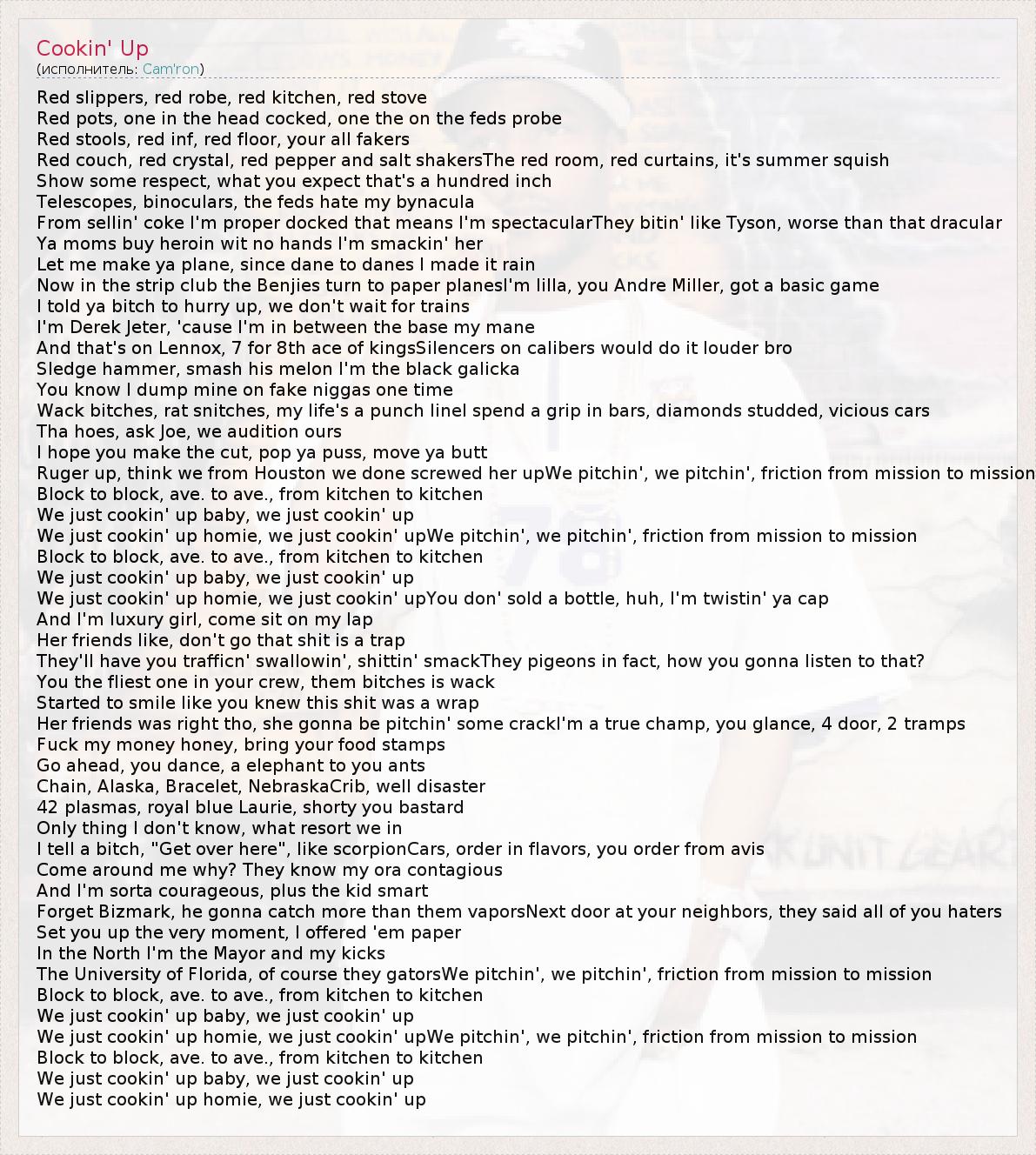 Red slippers, red robe, red kitchen, red stove Red pots, one in the head cocked, one the on the feds probe Red stools, red inf, red floor, your all fakers Red couch, red crystal, red pepper and salt shakersThe red room, red curtains, it's summer squish Show some respect, what you expect that's a hundred inch Telescopes, binoculars, the feds hate my bynacula From sellin' coke I'm proper docked that means I'm spectacularThey bitin' like Tyson, worse than that dracular Ya moms buy heroin wit no hands I'm smackin' her Let me make ya plane, since dane to danes I made it rain Now in the strip club the Benjies turn to paper planesI'm lilla, you Andre Miller, got a basic game I told ya bitch to hurry up, we don't wait for trains I'm Derek Jeter, 'cause I'm in between the base my mane And that's on Lennox, 7 for 8th ace of kingsSilencers on calibers would do it louder bro Sledge hammer, smash his melon I'm the black galicka You know I dump mine on fake niggas one time Wack bitches, rat snitches, my life's a punch lineI spend a grip in bars, diamonds studded, vicious cars Tha hoes, ask Joe, we audition ours I hope you make the cut, pop ya puss, move ya butt Ruger up, think we from Houston we done screwed her upWe pitchin', we pitchin', friction from mission to mission Block to block, ave. to ave., from kitchen to kitchen We just cookin' up baby, we just cookin' up We just cookin' up homie, we just cookin' upWe pitchin', we pitchin', friction from mission to mission Block to block, ave. to ave., from kitchen to kitchen We just cookin' up baby, we just cookin' up We just cookin' up homie, we just cookin' upYou don' sold a bottle, huh, I'm twistin' ya cap And I'm luxury girl, come sit on my lap Her friends like, don't go that shit is a trap They'll have you trafficn' swallowin', shittin' smackThey pigeons in fact, how you gonna listen to that? You the fliest one in your crew, them bitches is wack Started to smile like you knew this shit was a wrap Her friends was right tho, she gonna be pitchin' some crackI'm a true champ, you glance, 4 door, 2 tramps Fuck my money honey, bring your food stamps Go ahead, you dance, a elephant to you ants Chain, Alaska, Bracelet, NebraskaCrib, well disaster 42 plasmas, royal blue Laurie, shorty you bastard Only thing I don't know, what resort we in I tell a bitch, "Get over here", like scorpionCars, order in flavors, you order from avis Come around me why? They know my ora contagious And I'm sorta courageous, plus the kid smart Forget Bizmark, he gonna catch more than them vaporsNext door at your neighbors, they said all of you haters Set you up the very moment, I offered 'em paper In the North I'm the Mayor and my kicks The University of Florida, of course they gatorsWe pitchin', we pitchin', friction from mission to mission Block to block, ave. to ave., from kitchen to kitchen We just cookin' up baby, we just cookin' up We just cookin' up homie, we just cookin' upWe pitchin', we pitchin', friction from mission to mission Block to block, ave. to ave., from kitchen to kitchen We just cookin' up baby, we just cookin' up We just cookin' up homie, we just cookin' up